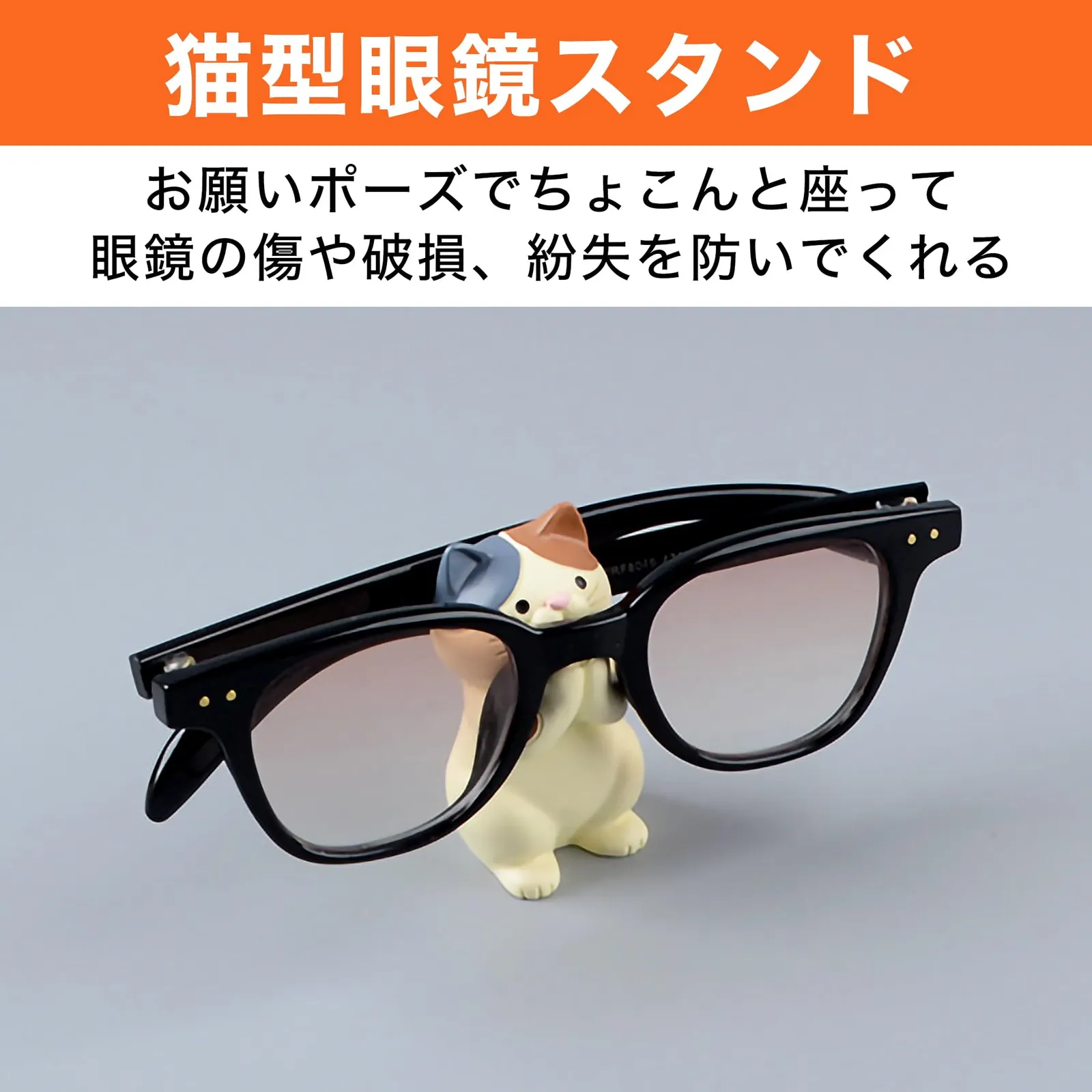 お願いポーズの猫型眼鏡スタンド:お願いポーズでちょこんと座っている猫型眼鏡スタンドは、長さ約32mm×幅約42mm×高さ約68mm、重量約65gです。眼鏡の傷や破損、紛失を防いでくれる便利なアイテムです。