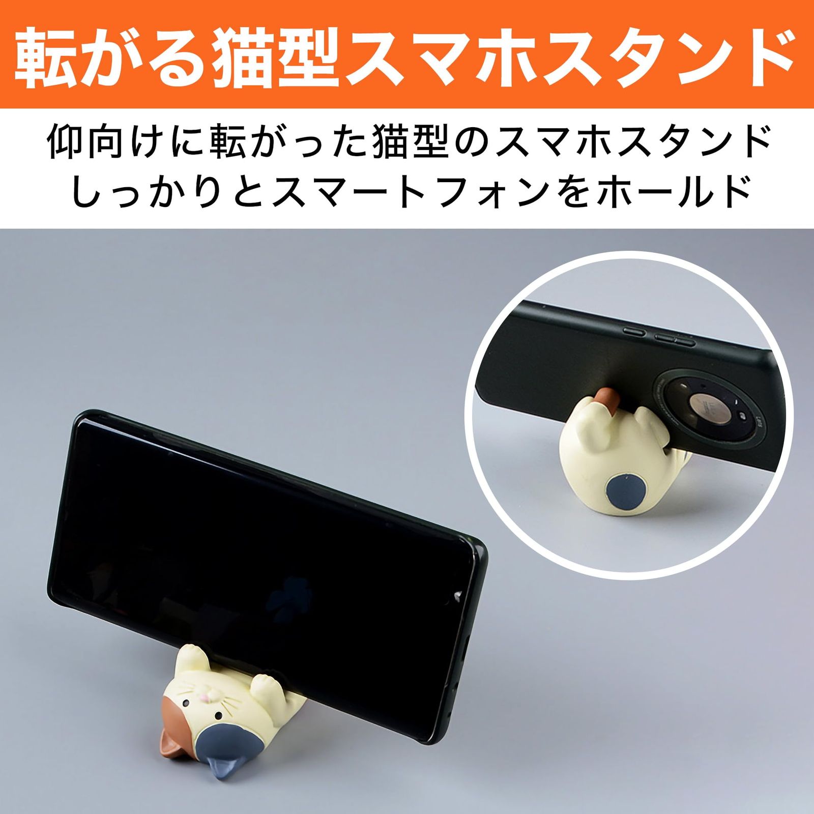 転がる猫型スマホスタンド:仰向けに転がった猫型のスマホスタンド長さ約50mm×幅約83mm×高さ約58mm、重量約165gです。ユーモアのあるポージングにキュンとするだけでなく、しっかりとスマートフォンをホールドしてくれる頼れるアイテムです。