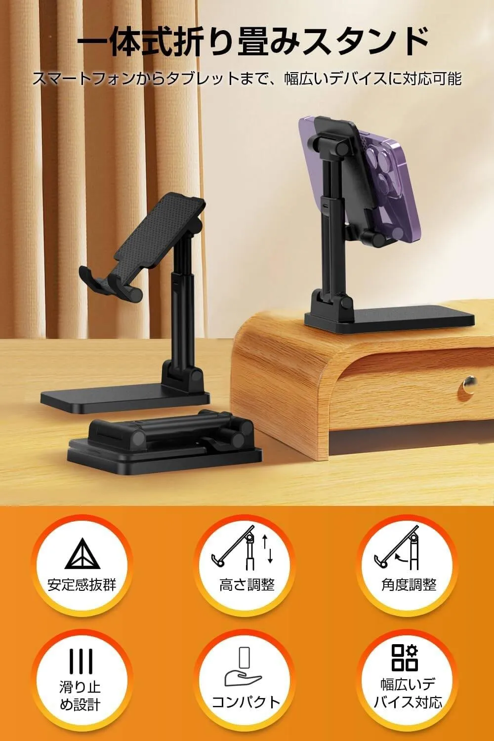 【自由調整・多角度対応】高さと角度を自由に調整できる スマホスタンド 卓上 は、使う人の視線や姿勢に合わせて最適な位置に設定できる便利な スマホ スタンド です。動画視聴、テレビ通話、レシピ確認、オンライン授業など、さまざまなシーンで活躍します。 スマホスタンド 折り畳み 機能を備えており、コンパクトに収納できるため外出や出張にも便利な 携帯スタンド です。 スマホ立て としての安定感も抜群で、滑り止め付きの設計により、机の上でもしっかり固定できます。 スマホ置き として使えば、デスクをすっきり整え、快適な作業環境をサポート。さらに、長時間の使用でも首や肩への負担を軽減できる ergonomic デザインで、テレワークや学習にも最適です。 iphone スタンド としても互換性が高く、iPhone、Androidなど多くのスマホに対応。折りたためばバッグやポケットにも簡単に収まり、持ち運びにも便利な phone stand です。シンプルながら高機能な スマホスタンド は、自宅、オフィス、旅行先などあらゆる場面で役立つ実用的な 携帯スタンド 卓上 です。