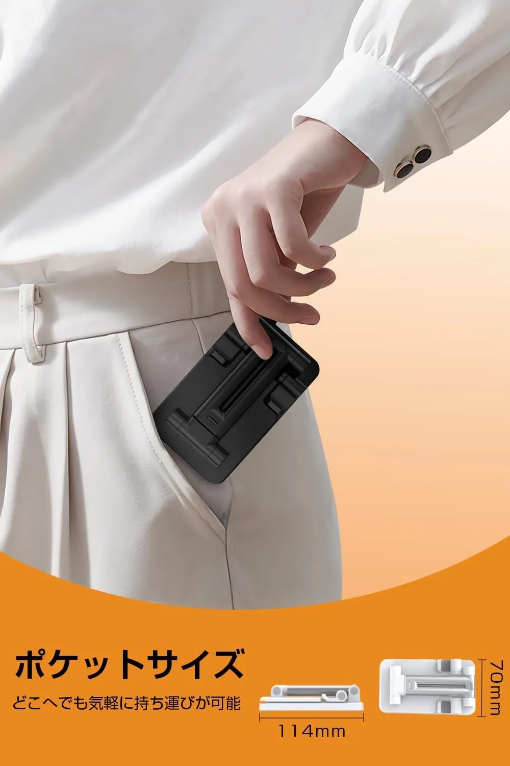 【折り畳み式で持ち運び便利な スマホスタンド 】この スマホスタンド 折り畳み は、軽量かつスリムなデザインで、ポケットや小さなバッグにも簡単に収納できるコンパクトな 携帯スタンド です。折り畳むと手のひらサイズになり、外出や出張、旅行時にも気軽に持ち運べる スマホスタンド 卓上。カフェでの作業、新幹線での動画視聴、飛行機での映画鑑賞など、さまざまなシーンで大活躍します。安定感のある設計で、スマホ立て としてしっかり固定でき、充電ケーブルを差したままでも使用可能な便利な スマホ置き。また、動画撮影や自撮りスタンド としても最適で、SNS投稿やオンライン通話の際にも重宝します。phone stand として海外でも高評価を得ており、スマホ スタンド や 携帯スタンド 卓上 として日常からビジネス・旅行まで幅広く対応。スタイリッシュで機能的なデザインの スマホスタンド は、iPhoneやAndroid、ipad スタンドとしても利用できる万能モデル。どこへでも持ち運べる便利な 折り畳み式 スマホスタンド です。