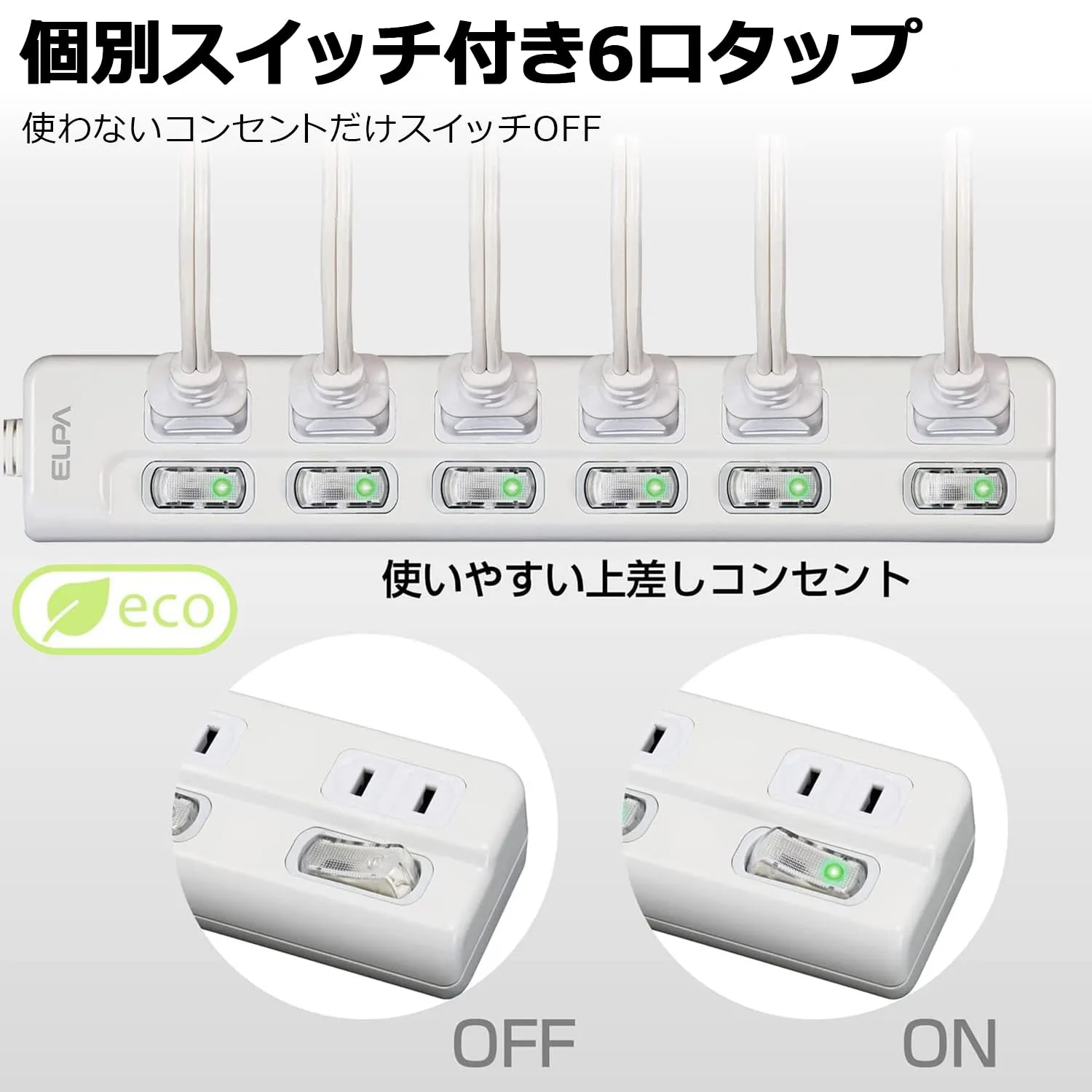 エルパ (ELPA) スイッチ付タップ コンセント 延長コード LED 上差し 6個口 2m WLS-LU62EB(W)