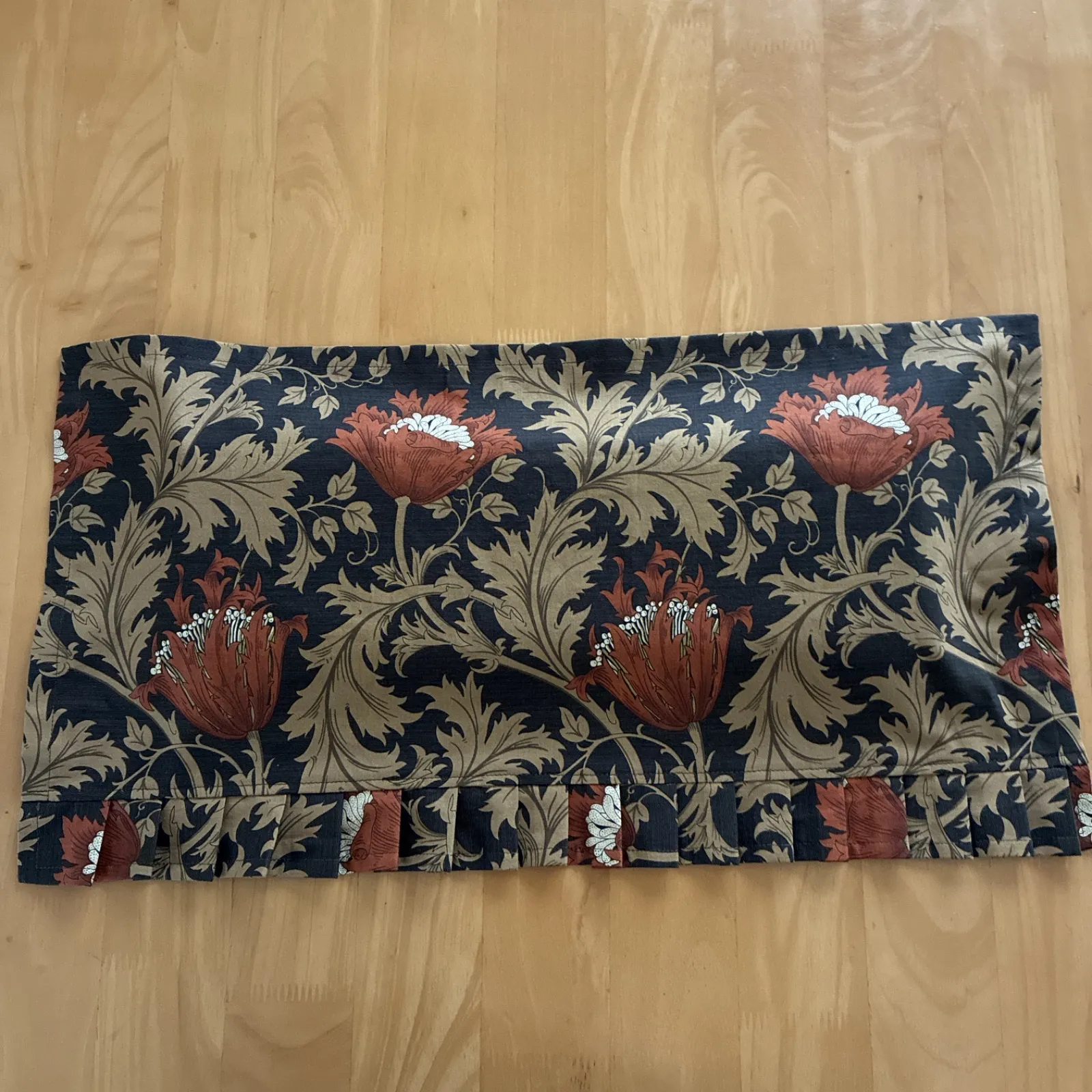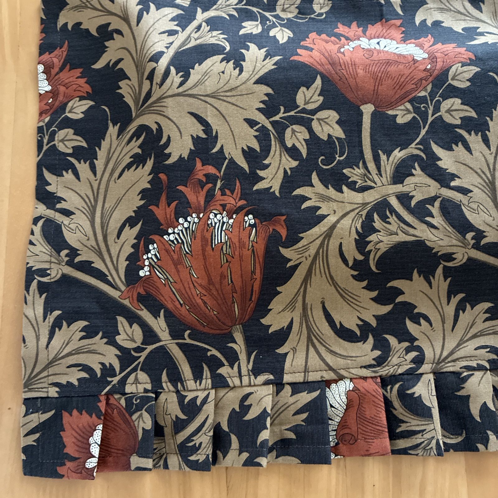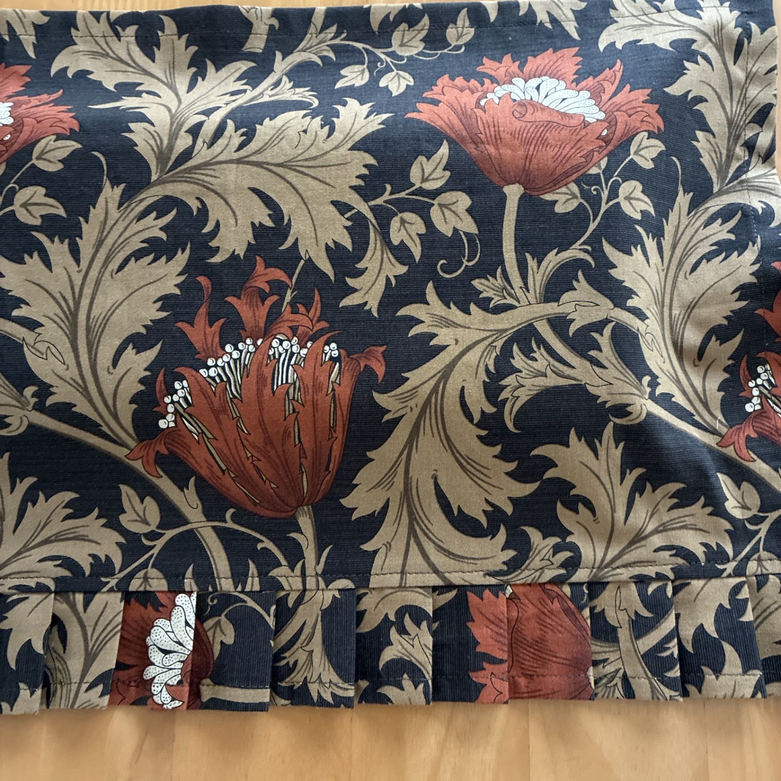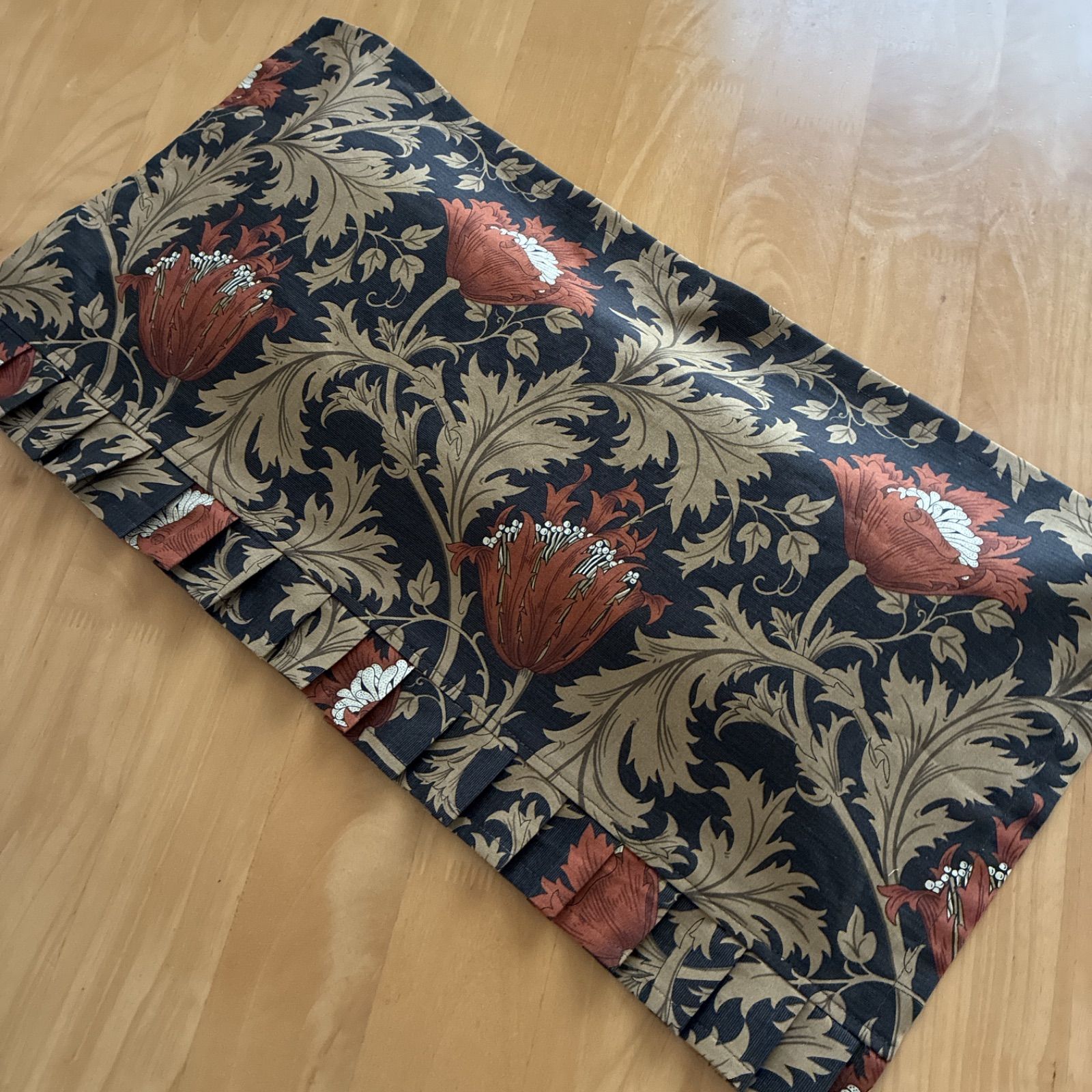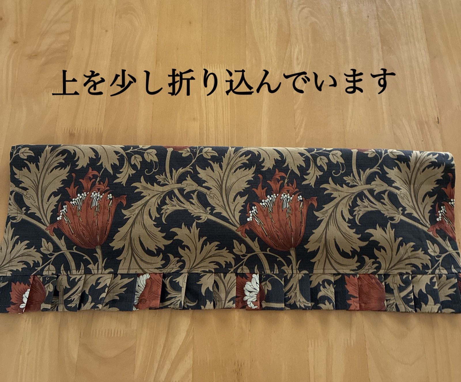 ◆ウイリアムモリスの「アネモネ」を使用しました。 地の色は黒に近いダークブラウン、そこに横幅約10cmのライトブラウン(赤茶色)のお花(アネモネ)とベージュで描かれた葉っぱとのコントラストがお上品で綺麗な生地です。 縦の長さは32cmで下部4cmはフリルになっています。フリルと言っても畳み込んであるプリーツフリルなので、シックな感じに仕上がっています。キュートな感じではありません。 花柄と聞くと「女性用」と思われがちですが、この生地の色合い・カットですと男性用もご使用頂けるガラだと思います。 (まゆみんの主人に聞いたところ「いいじゃん」と言っていました)