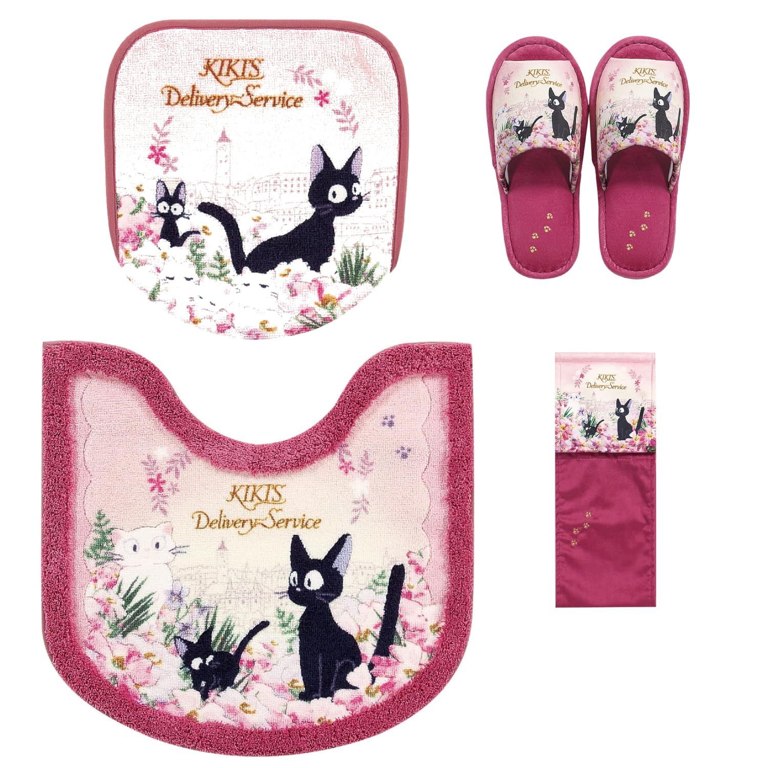 魔女の宅急便 トイレマットセット 4点セット ジブリ ジジ センコー トワイライトジジ トイレマット 58×60cm 兼用フタカバー スリッパ ペーパーホルダーカバー ピンク トイレタリーセット トイレカバーセット 吸着タイプ キャラクターグッズ キャラ か