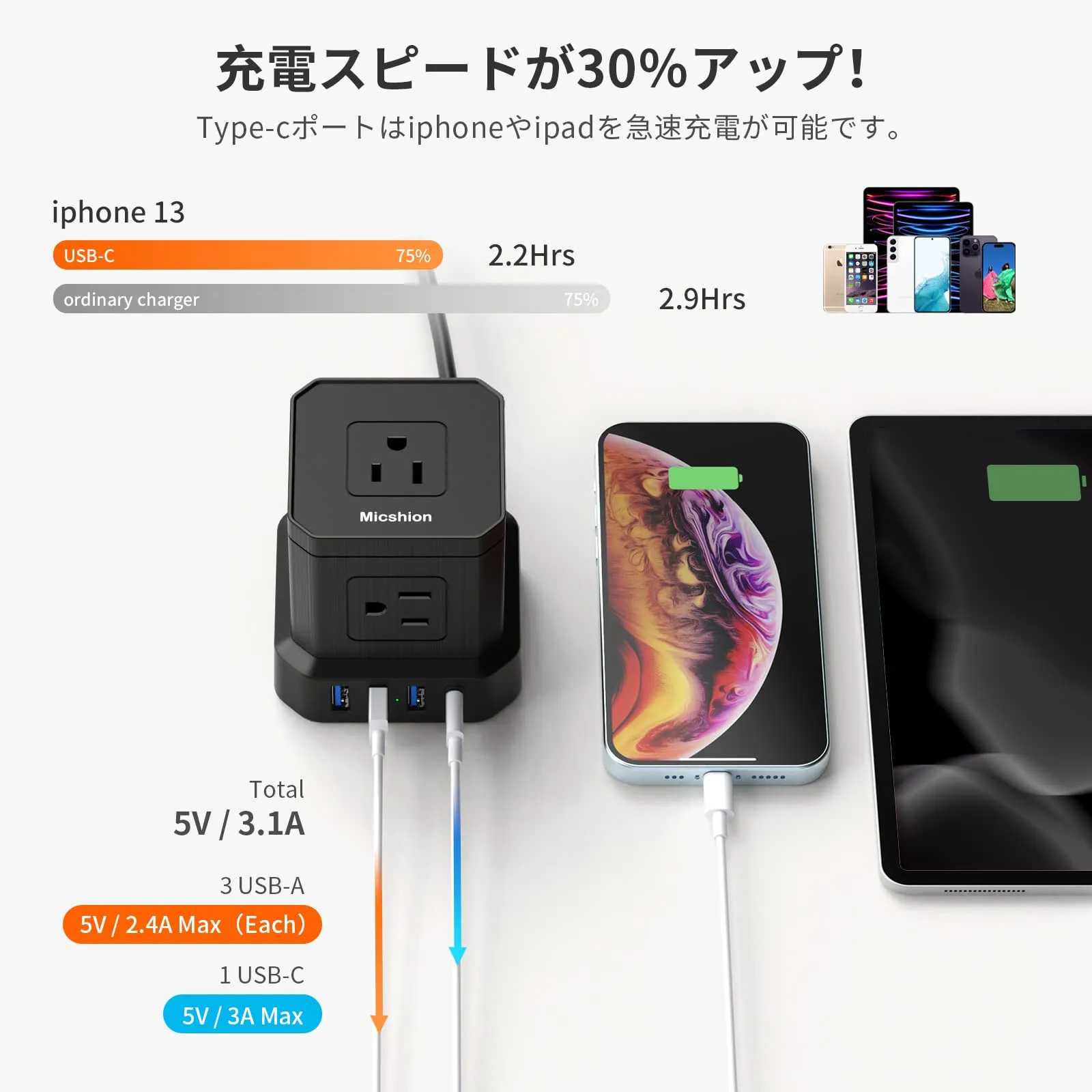 【5個ACポートと4個USBポート】5口のAC差込口と1つのUSB Type-Cポート、3つのUSB-Aポートを備えており、スマホやタブレットをコンセント タップ用プラグなしで接続できる手軽さも適当です。USB Type-Cポートは、iPhoneへ一般的な5W出力の充電器に比べ、充電スピードが30%アップします。複数機器を接続した場合、最大2400Wの消費電力に対応し、自動判別機能を通して、接続されたデバイスに最適な電流を出力します。パソコンやテレビ周りなど、コードが集中しがちな場所でもすっきりと使えます。
