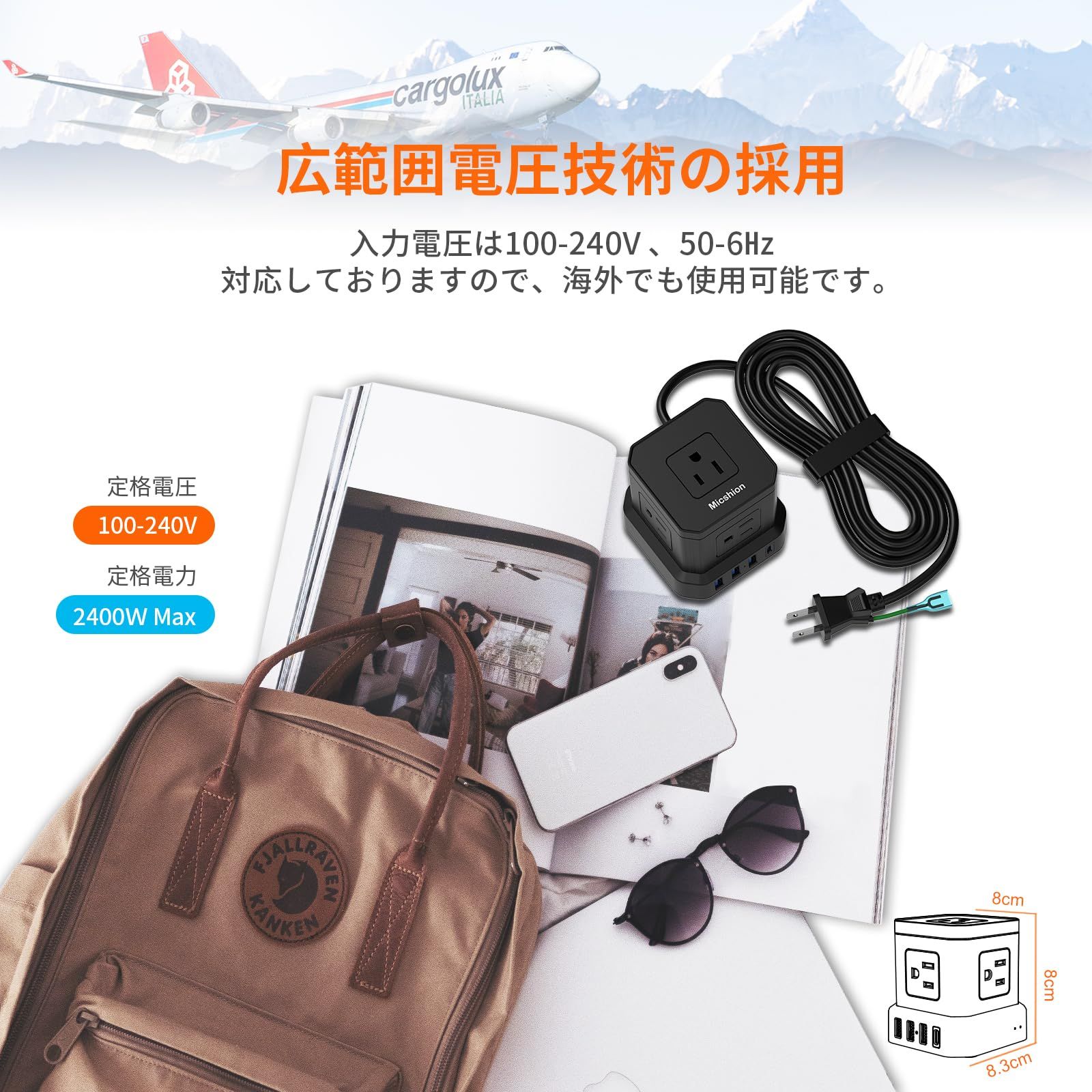 【広範囲電圧技術&コンパクト】市販品のAC 100と比べて、このマルチタップは広範囲電圧技術を採用して、広範囲電圧技術で100V~240Ⅴの区間で安 心に使用することができます。それに加えて、多数の差込口を備えながらも、幅8×奥行き8×高さ8.3cmとコンパクトで、省スペースで使えるので、デスクの上やテレビ周りなど、さまざまな場所で重宝します。重さは432gと軽量で、持ち運びもしやすいので、旅先や出張先でのコンセント不足を解消できます。海外でも使用可能です。