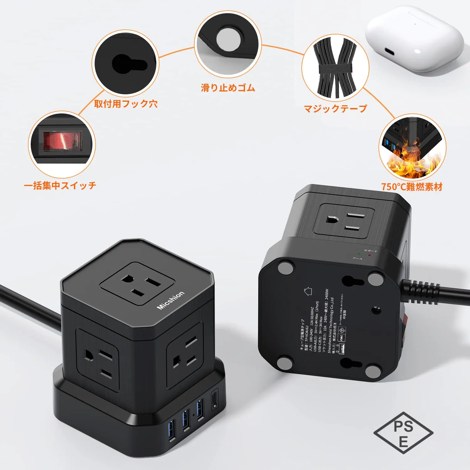 新品 キューブ型電源タップ 3M Type-C付 コンセントusb付き 延長コード 5個AC口 4個USBポート 雷ガード 電源タップ usb付き タコ足配線 テーブルタップ OAタップ マルチタップ 安全保護機能 自宅用 会社用 黒…
