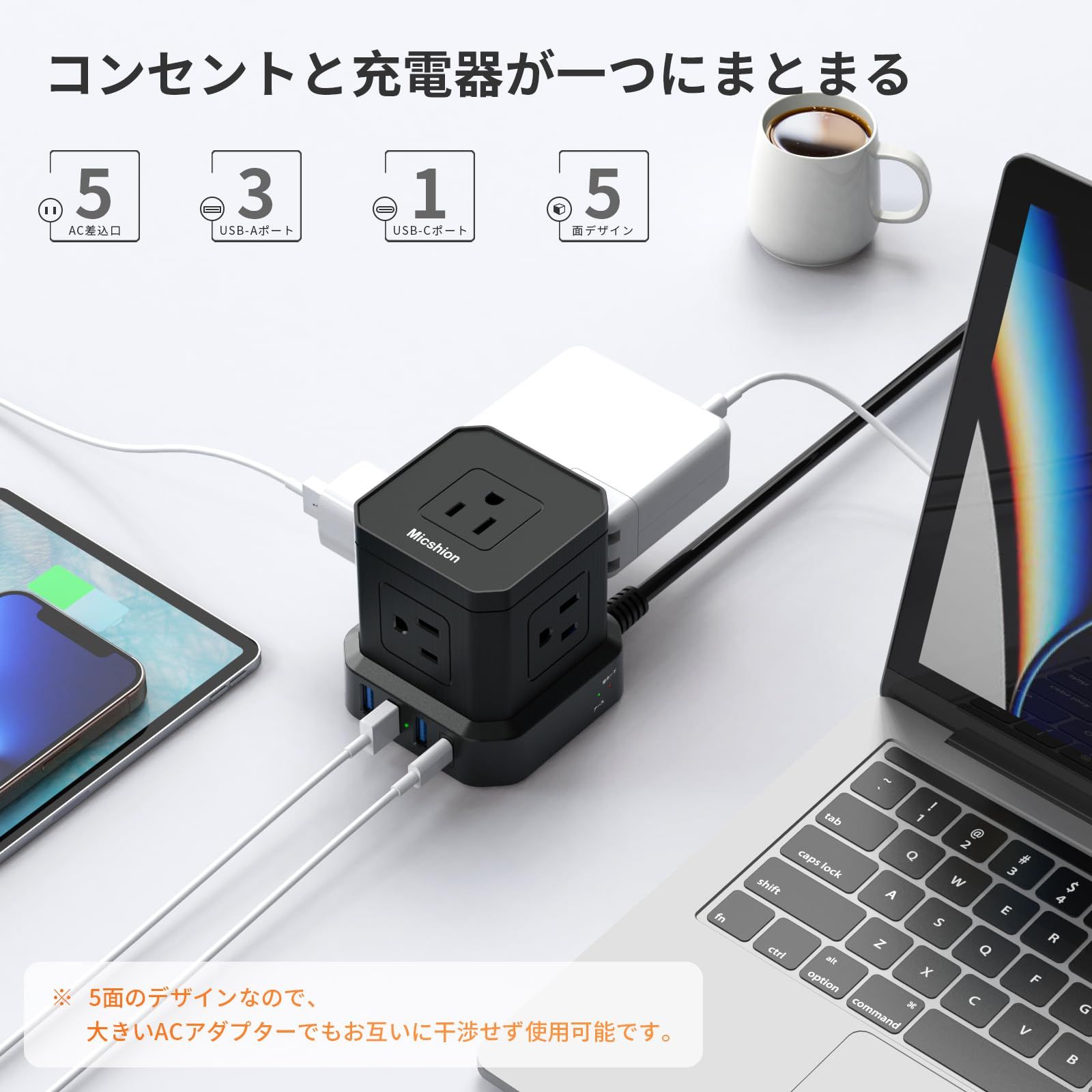 【キューブ型電源タップ】このタコ足コンセントは、立体集成構造を採用し、コンパクトで省スペースです。キューブ型形状により、電源タップに接続した際も隣のコンセントへの干渉を抑えます。卓上で安定感をもたせるため電源コードを底面近くに配置した低重心設計を採用しており、重いアダプターをかけても倒れにくいです。パソコン周りやテレビ周りなど、限られたスペースを有効活用できます。