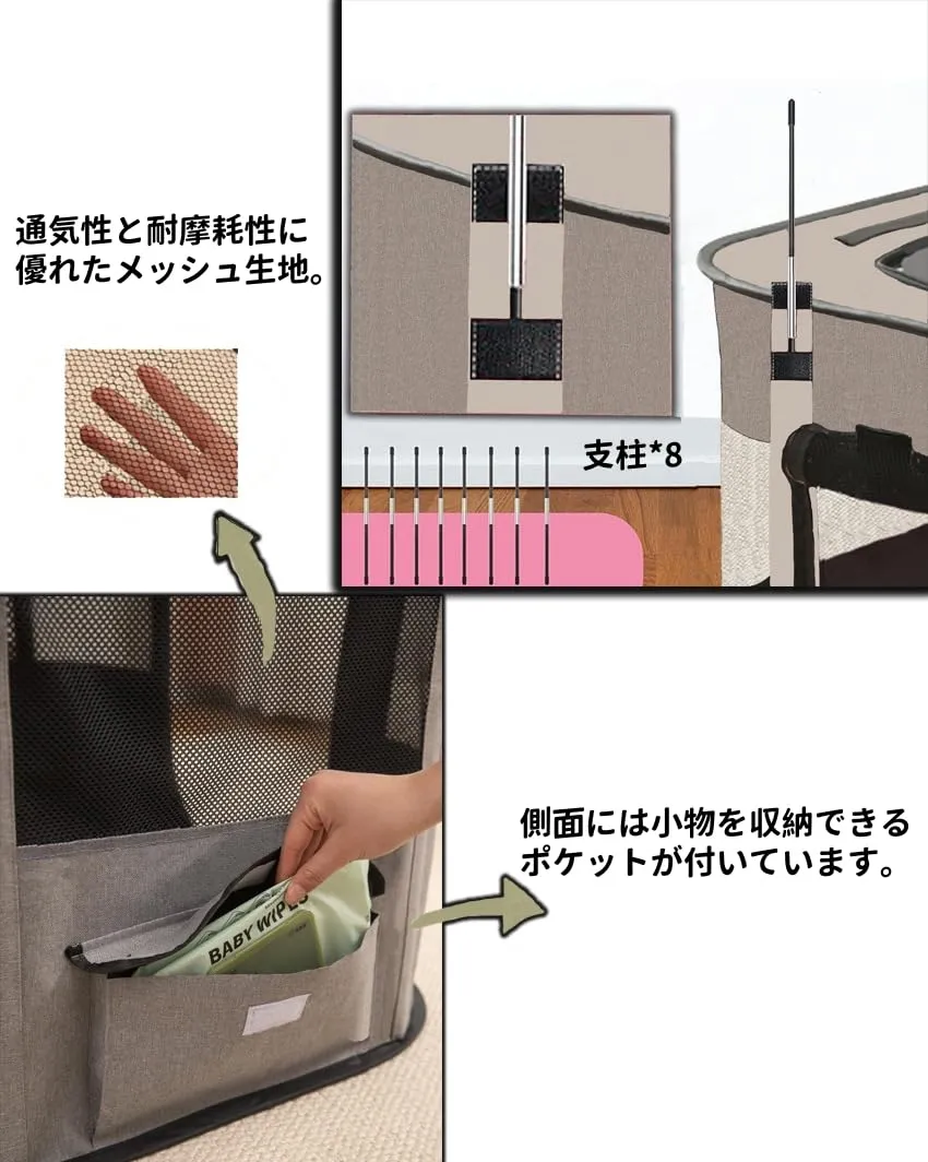 【新しい 折り畳み ペットサークル 】長方形のデザインの方がお部屋の構造にフィットします。このペット用ケージの四方に通気ネットがあり、ペットが中にいても退屈することがなく、飼い主もこの通気ネットを通してペットの一挙手一投足を観察し、相互作用することができ、また、ペットの出入りもしやすいように、カーテン式のドアを採用しています。ペットを飼う生活をより楽しくすることができる。 ??