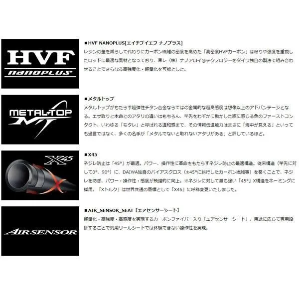 【73-195】(7:3調子) 乗せ調子テンヤタチウオロッドでありつつ、一般的な73調子とは異なる専用調子を追求。 繊細な穂先と強靭なバットを両立しつつ、フッキングを意識した急テーパーの穂持ちを備える。 厳寒期や活性の低いタチウオにも違和感なく喰わせ、一瞬のチャンスを逃さずフッキングすることが可能。 穂先はタチウオの繊細なアタリを感じ、フッキング可能な本アタリを感じることのできる高感度メタルトップを採用。 ブランクスには軽量なHVFナノプラスを使用し、さらにX45で強化することで瞬間的なフッキングと大型タチウオにも負けないパワーを備える。 リールシートはエアセンサーシートを採用することで快適なパーミングと軽量化を両立した。 さまざまなシチュエーションや釣法に対応できるアイテムをラインナップ。 タチウオを戦略的に攻略できる。 製品特徴