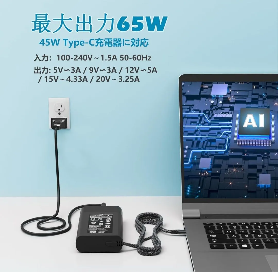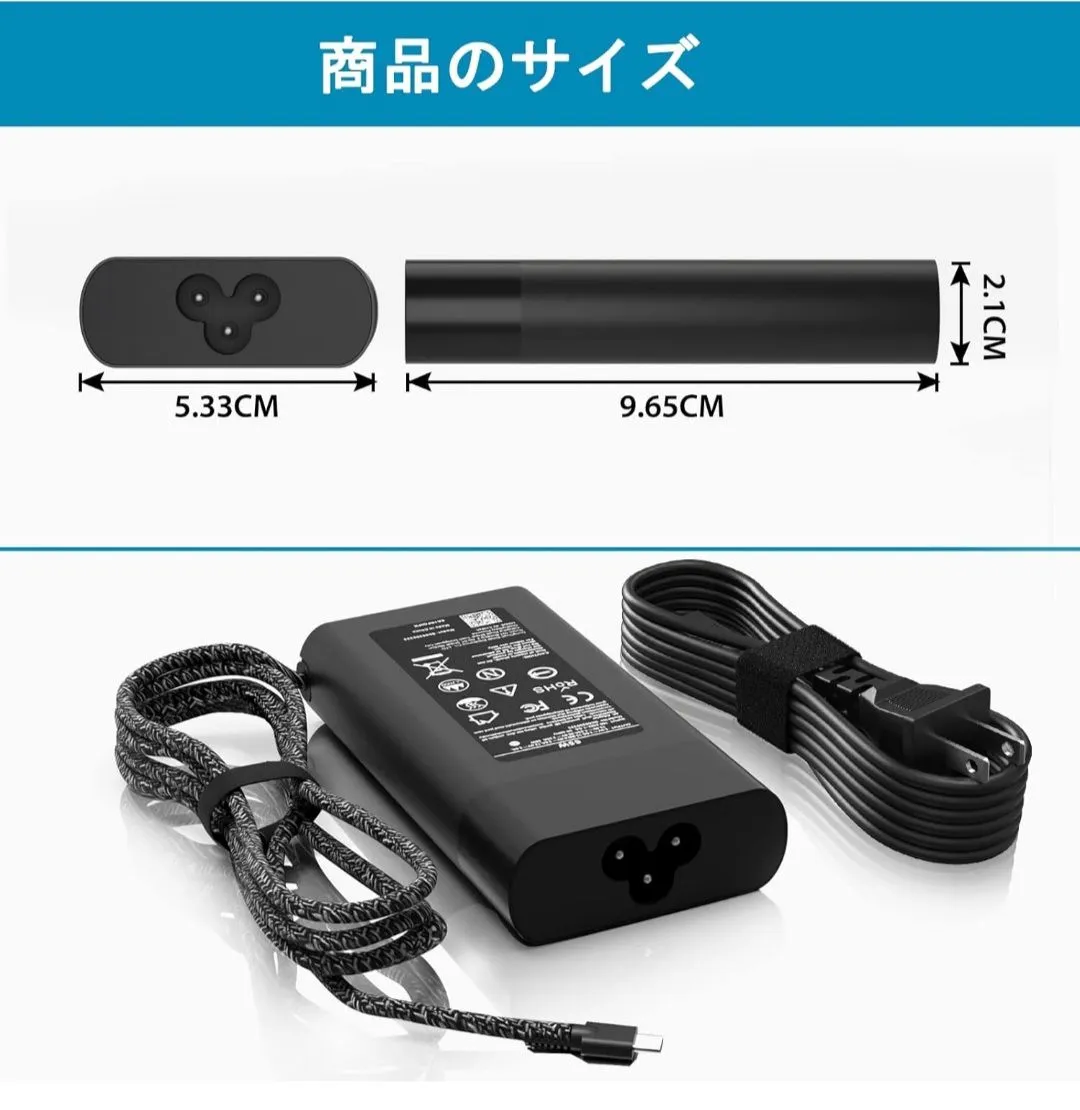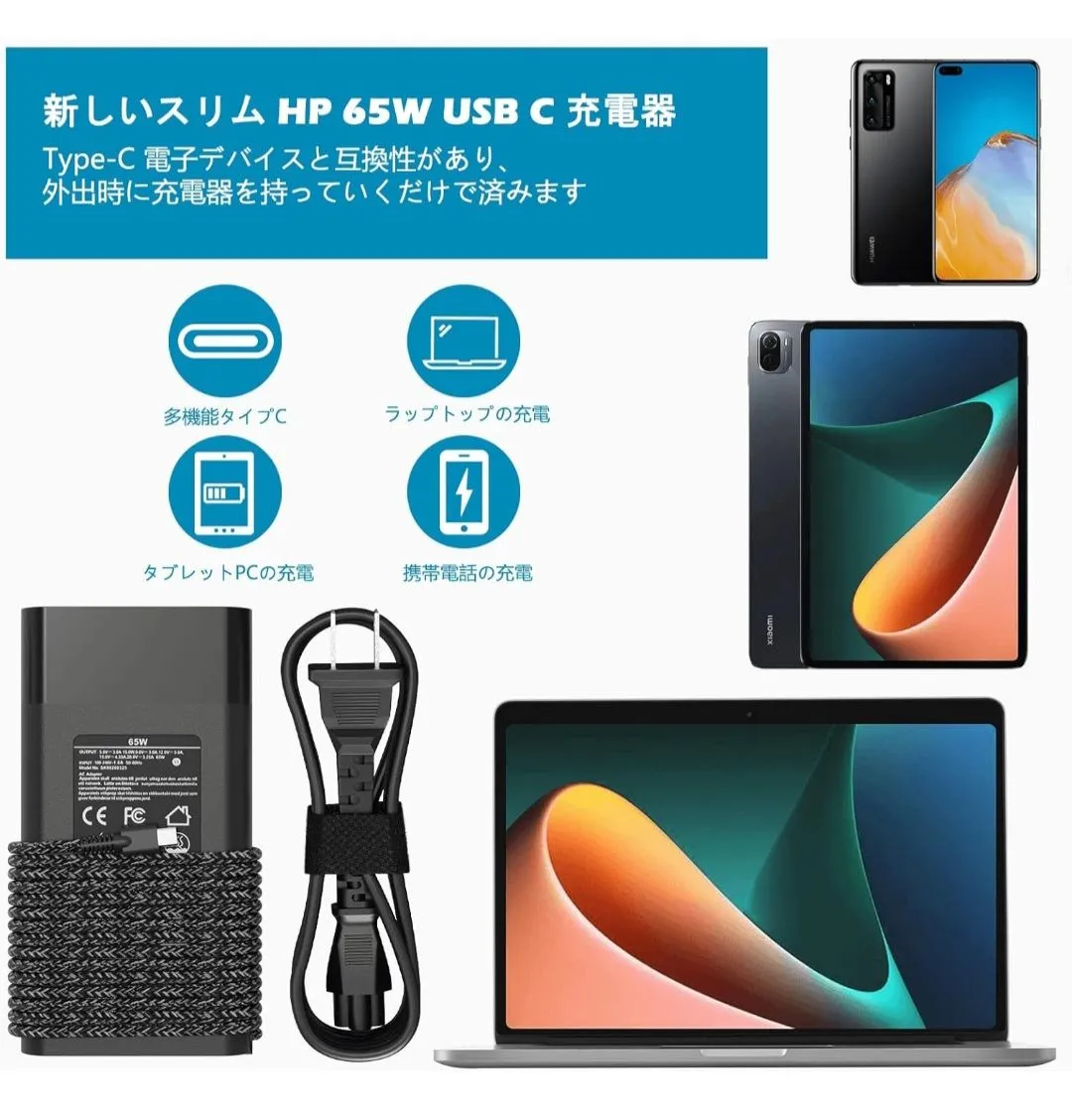 ●「HP電源アダプター電源仕様」入力:100-240V 50-60Hz、出力:5V/3A、9V/3A、15V/3A、20V/3.25A、コネクタサイズ:Type-C(USB C)ポート、ワット:65W(45W Type-C ノートパソコン充電器と互換性があります)