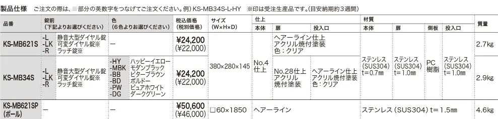 扉・投入口:ヘアーライン仕上+アクリル焼付塗装(クリア色)