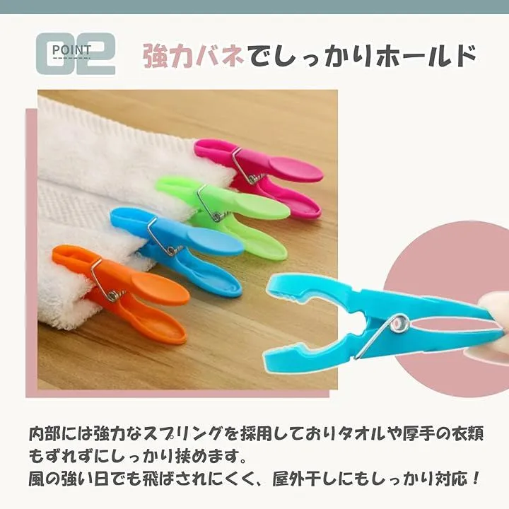 「強力バネでしっかりホールド」 内部には強力なスプリングを採用しており、タオルや厚手の衣類もずれずにしっかり挟めます。