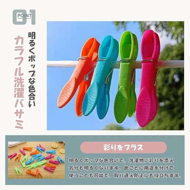 「商品詳細」 セット内容:洗濯バサミ24個 カラー:グリーン、ブルー、オレンジ、ピンク(各色ミックス) サイズ:約7.3cm x 1.1cm x 3.0cm 素材:高品質プラスチック+スチールスプリング 用途:洗濯物干し、布団干し、食品袋クリップ、書類仮留め、園芸用など