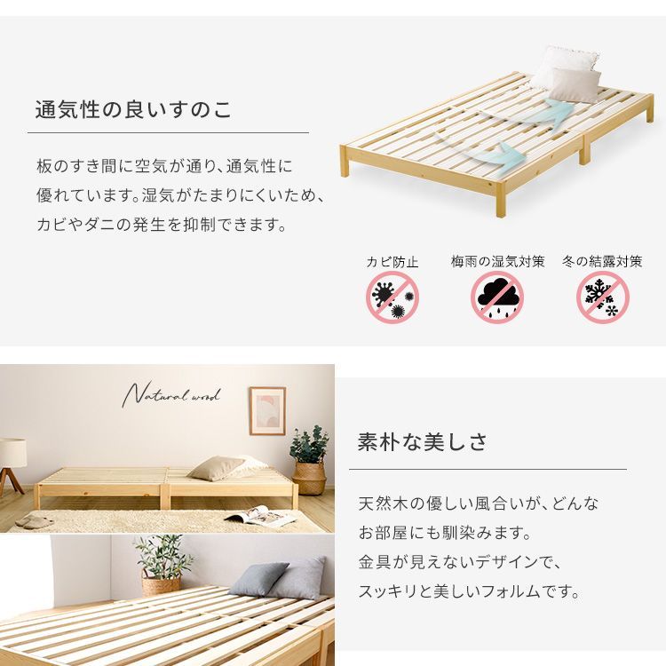 【梱包重量】 ベッドSS:(約)20kg マットレスSS:(約)13.7kg カラー ナチュラル/ホワイト ナチュラル/ブラック 素材 ベッド:フレーム・脚部・棚:天然木パイン[ラッカー塗装] すのこ:LVL積層合板 マットレス:ポケットコイル、不織布、ウレタンフォーム、ニット生地(ポリエステル100%) その他 組立時間:2分