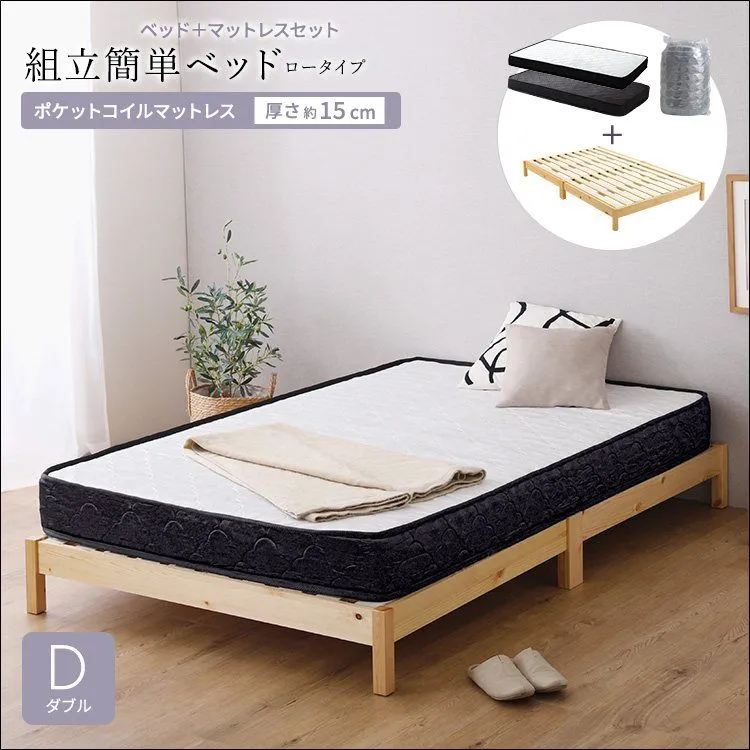 2分で完成!組立簡単ベッド ポケットコイルマットレスセット(ダブル) TRS-SRM-D ベッド マットレス セット 組立簡単 ベッド色 ナチュラル マットレス色 ブラック ホワイト 送料無料 【全2色】[8070]
