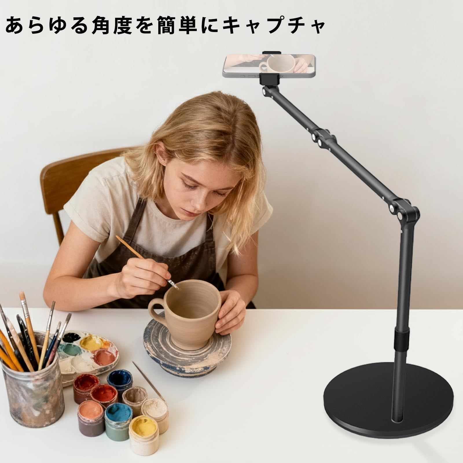 【新着商品】iPhone/Android全機種 スマホ撮影スタンド 加重ベース 高さ調整可能 360°回転ホルダー 45cmロングアーム 折りたたみ式 俯瞰撮影対応 卓上 スタンド アーム スマホ スマホスタンド