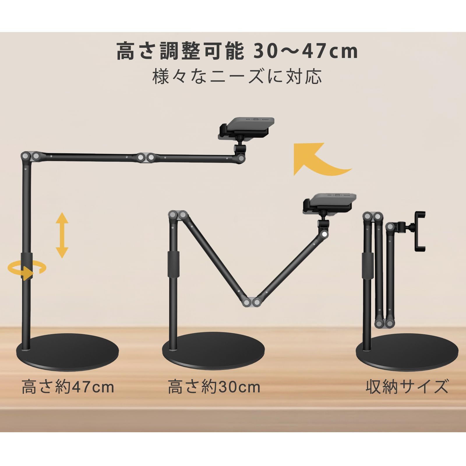 【高さ調整可能】高さは約30cm47cmまで調整可能。デスク上のスマホ スタンドとしても、オーバーヘッド三脚としても使用でき、自由な撮影ポジションを実現します。折りたたみ式のデザインにより、分解せずに簡単に収納でき、使用していないときはスペースをすっきり保つことができます。 最後までご確認頂き誠にありがとうございました。 ご確認頂き、ご購入いただけましたら幸いです。 何かご不明点などがございましたらお気軽にメッセージからお問い合わせ下さい。