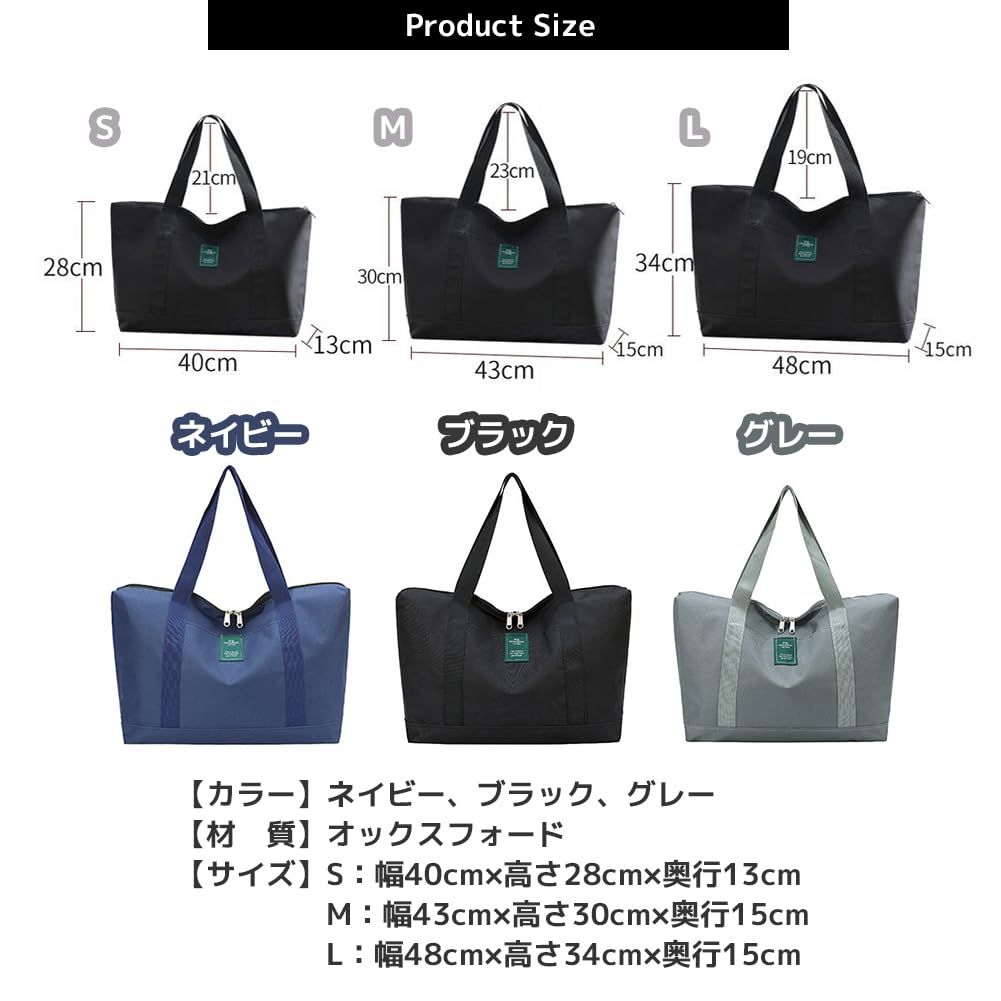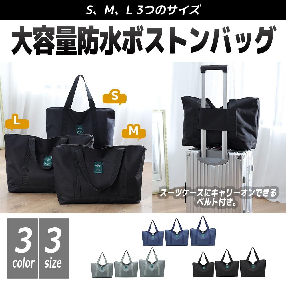 【サイズ】S:幅40cm×高さ28cm×奥行13cm、M:幅43cm×高さ30cm×奥行15cm、L:幅48cm×高さ34cm×奥行15cm [FUPUTWO] ボストンバッグ 大容量 防水 トラベルバッグ 旅行 キャリーオン トートバッグ 旅行、出張、スポーツジム、買い物など様々なシーンで大活躍の大容量防水ボストンバッグです。スーツケースにキャリーオンできるベルト付き。大中小3つのサイズからお選びいただける軽量のトラベルバッグです。 表地は撥水性に優れた高密度オックスフォード生地を使用しており、急な雨でも大丈夫な手提げバッグ。切れや破れに強く、耐摩耗性のある耐久性に優れたトートバッグです。 ファスナー開閉式のメイン収納内には大空間が広がります。前面のポケット、内ポケットは各一つあり、小物収納に便利です。背面にはキャリーオンベルト付きですのでスーツケースとの相性抜群のボストンバッグ。 着替え、タオル、ノートPCやタブレットなど入る大容量。旅行、ビジネス、普段使い、どんなシーンにも使いやすく、荷物が増えた時のサブバッグやエコバッグとしてお持ちいただけるトートバッグです。