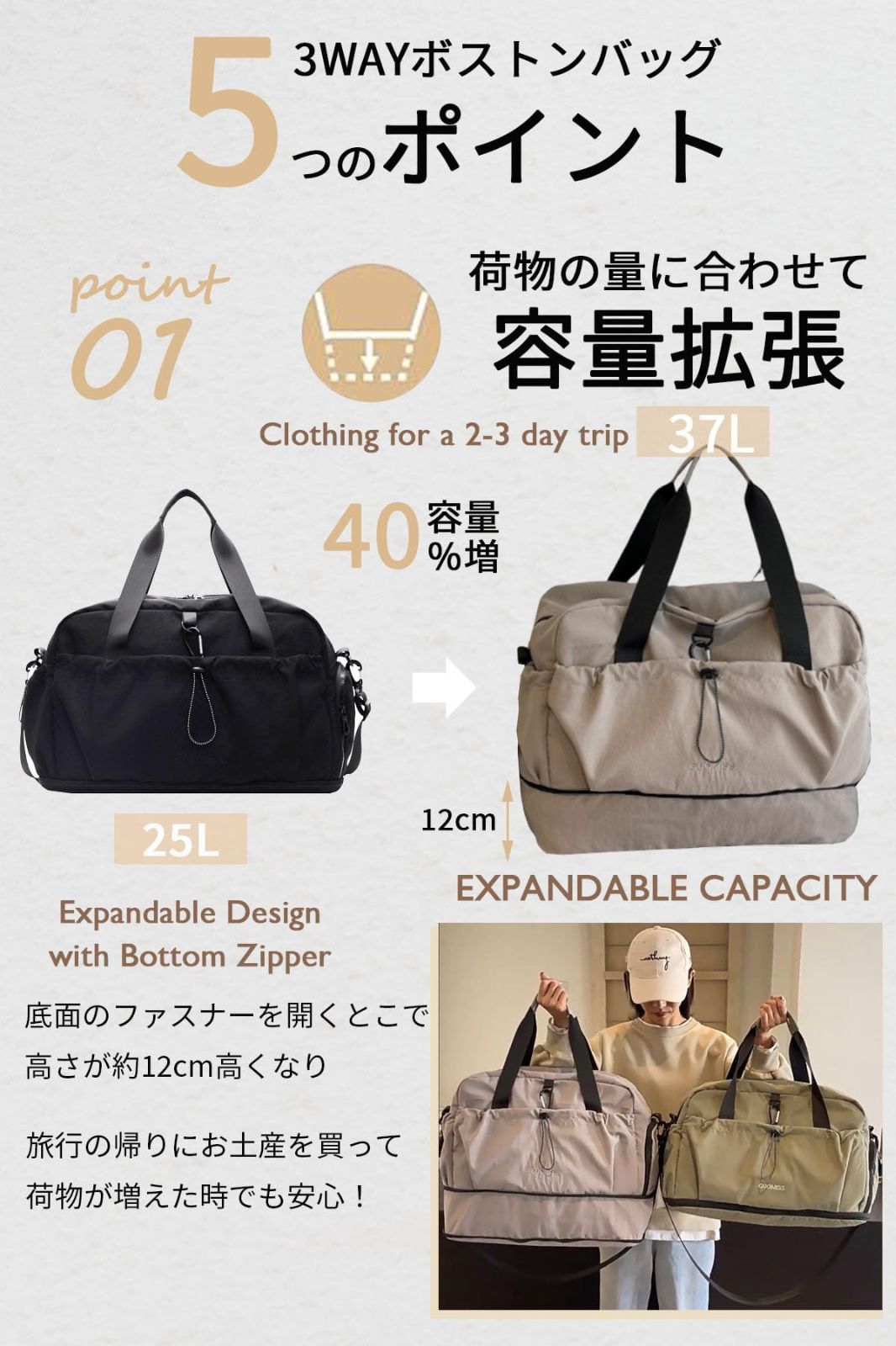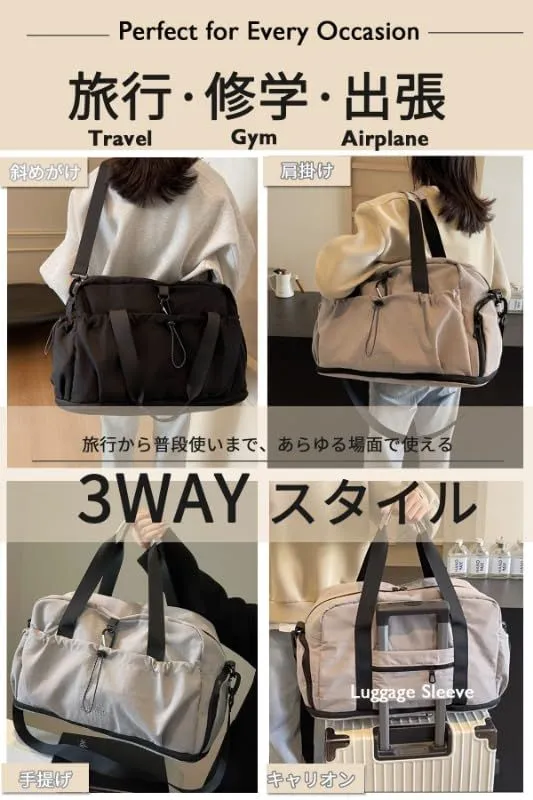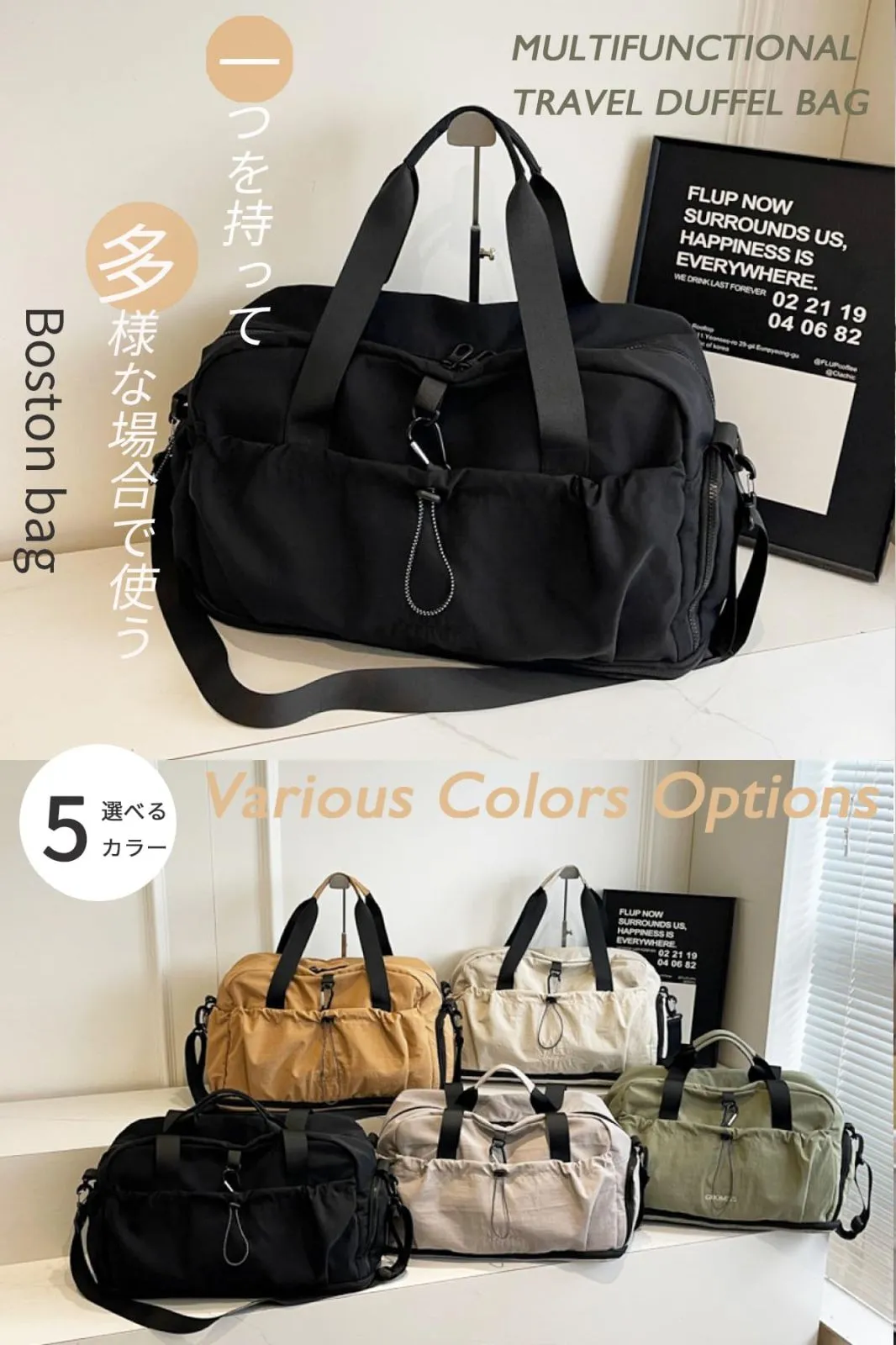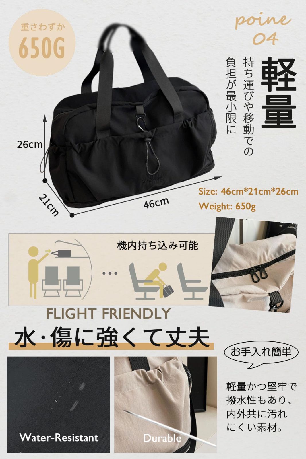 【軽量で機能的な素材】 軽量なナイロン生地を使用し、カバン内の荷物をしっかり守ります。内部には濡れたものを収納できる防水ポケットがあり、側面には靴を収納できるポケット、反対側には調節可能なサイドポケットを備えています。また、背面には行李箱に掛けられる機能があり、さらに便利なファスナーポケットも付いています。