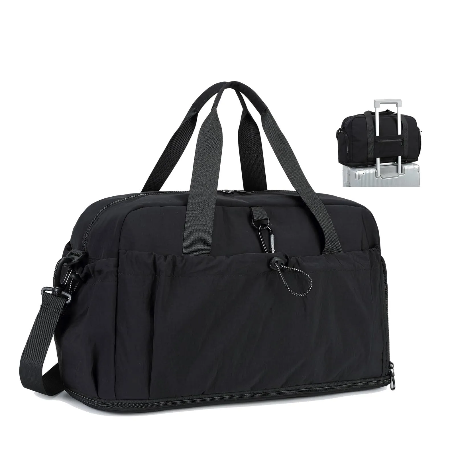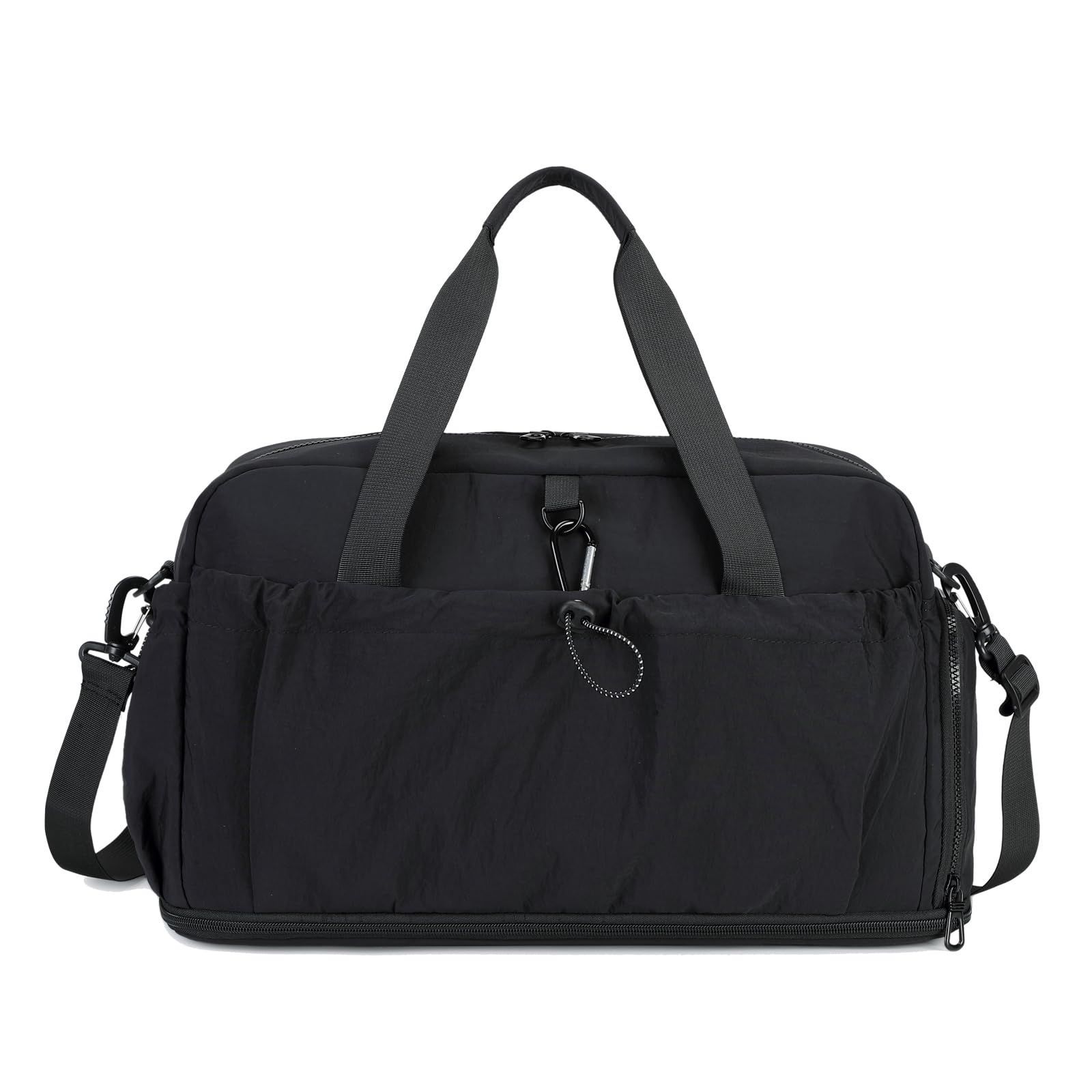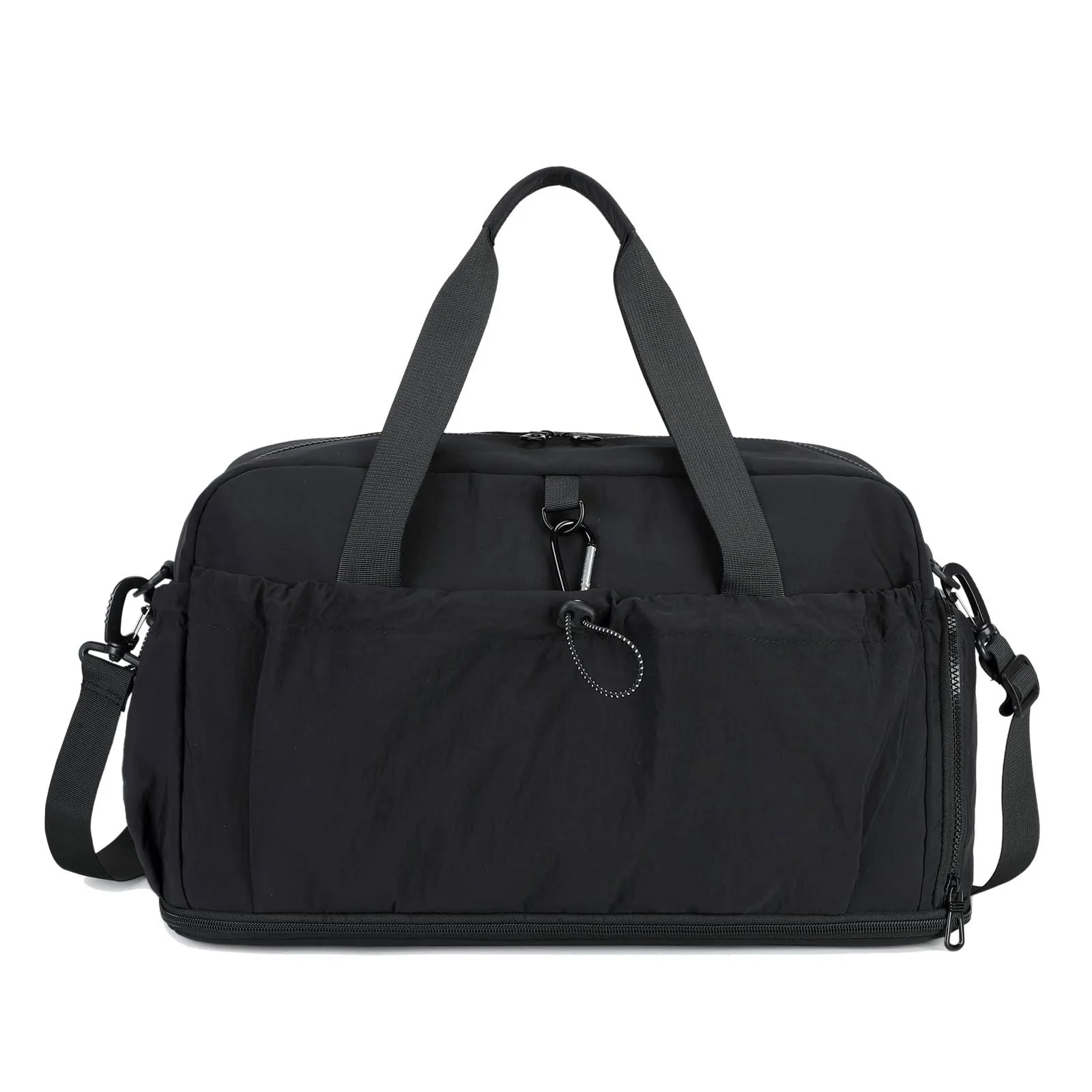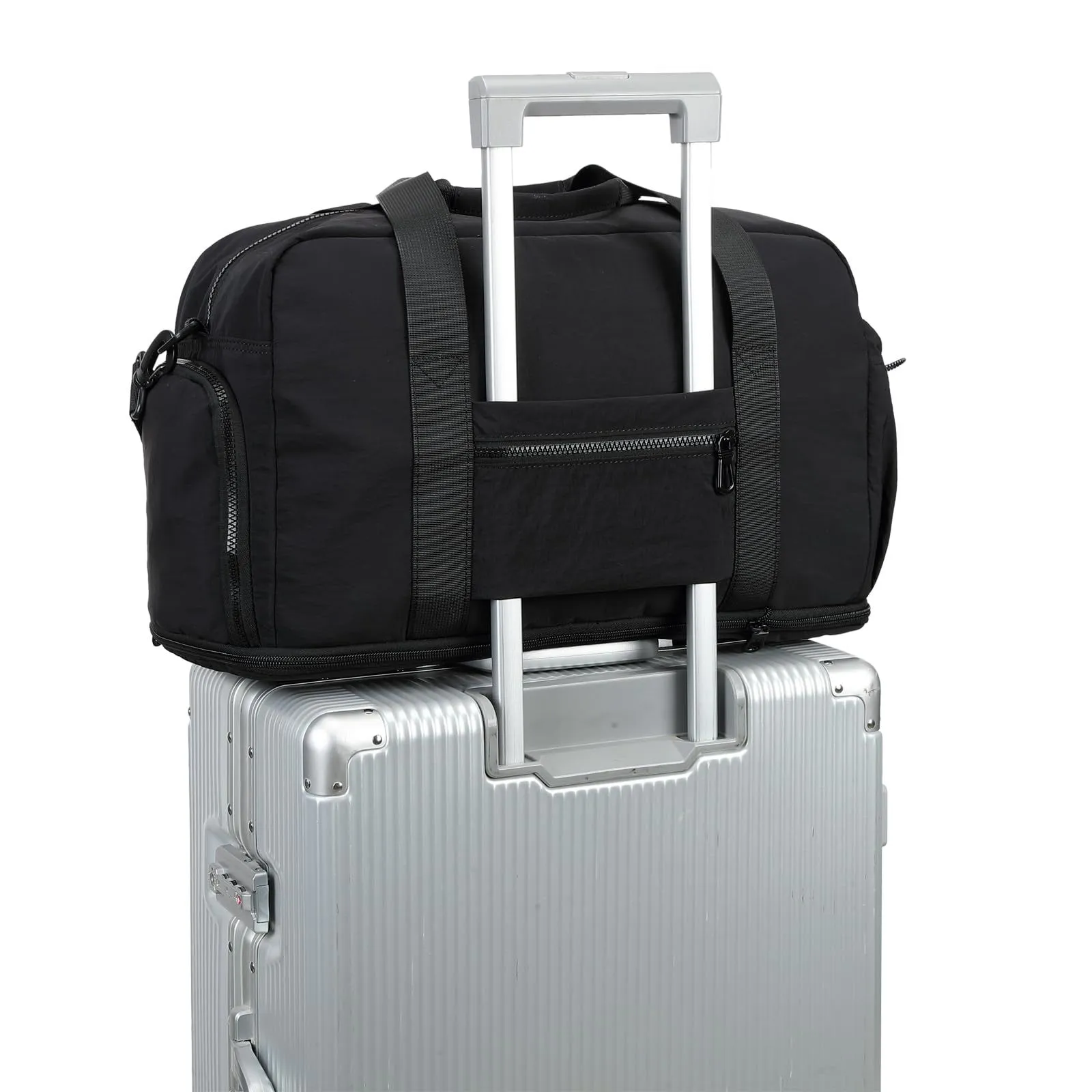 【軽量で機能的な素材】 軽量なナイロン生地を使用し、カバン内の荷物をしっかり守ります。内部には濡れたものを収納できる防水ポケットがあり、側面には靴を収納できるポケット、反対側には調節可能なサイドポケットを備えています。また、背面には行李箱に掛けられる機能があり、さらに便利なファスナーポケットも付いています。