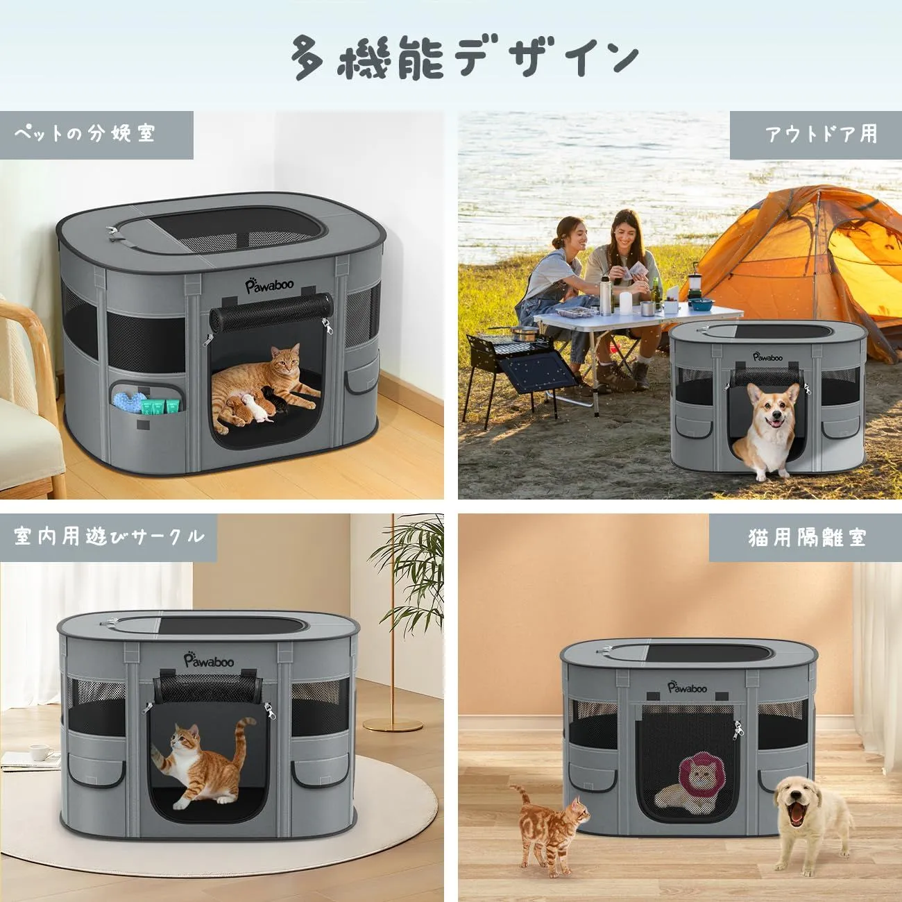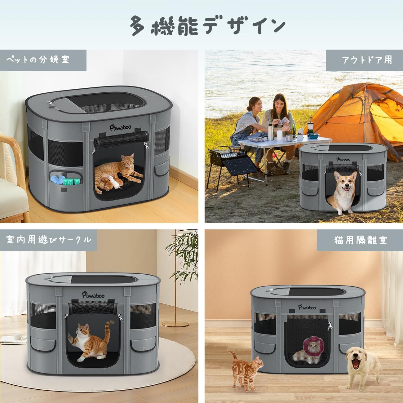 「幅広い使用場面」 ペットの遊びサークルとしてはもちろん、ペットの分娩室、ベビーサークルとしても適用します。屋根付きのデザインで、おもちゃなどの収納サークルとしての活躍も期待できます!4本の固定用鉄棒を付属して、公園などで使うときに、土に差し込んで固定して、やんちゃなペットでも安心に使用できます。付属の折り畳みボウルを持って、ペットを連れてピクニックでも行きましょう!