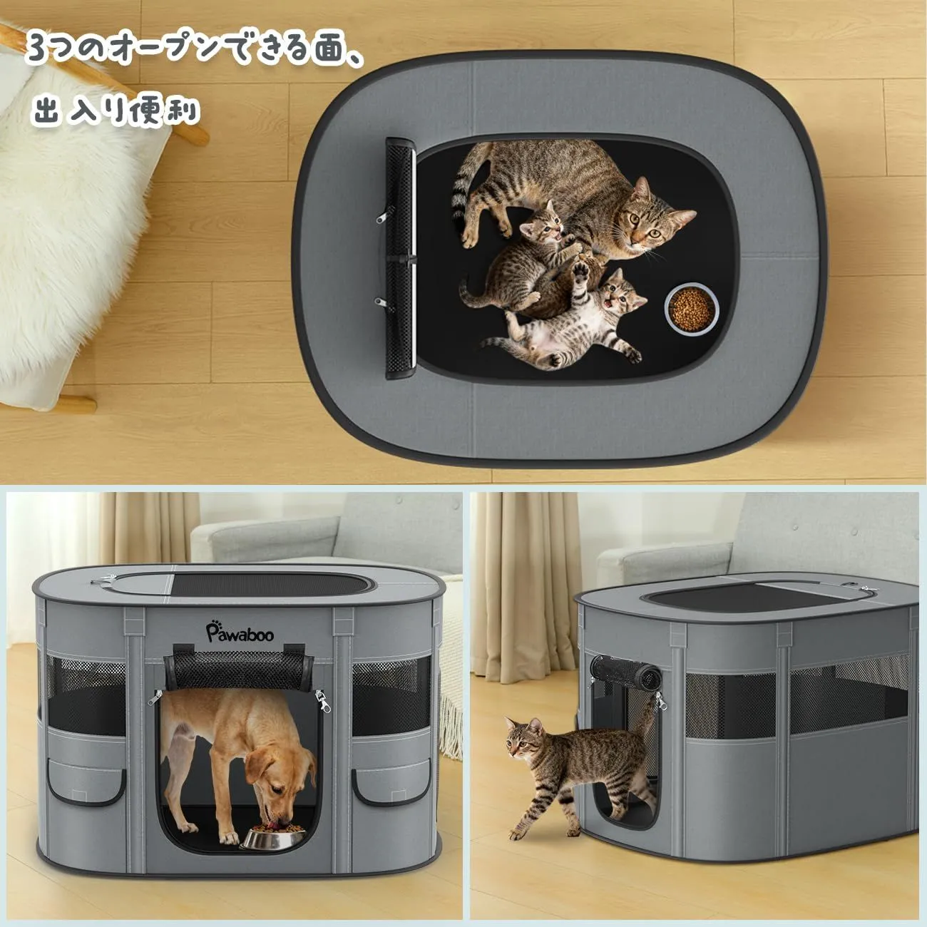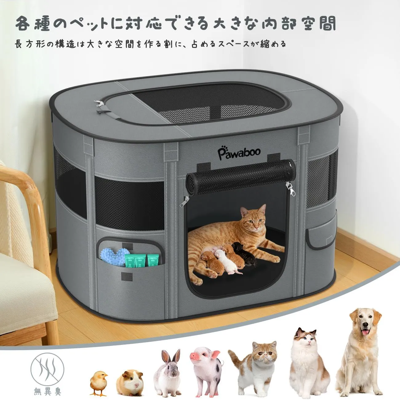 「側面ファスナー式扉設計」 製品全体は8本のガラス繊維棒で支えられ、側面にダブルファスナー式の扉を追加して、安定性にがあり、ペットの分娩室としても適用し、哺乳期の猫ママと子猫たちが自由に出入りできる優しいデザインです。扉は巻き上げて固定できます。外側に更に収納用のポケットがあり、収納袋、付属の折り畳めるボウル又は他の小物収納にばっちりです。