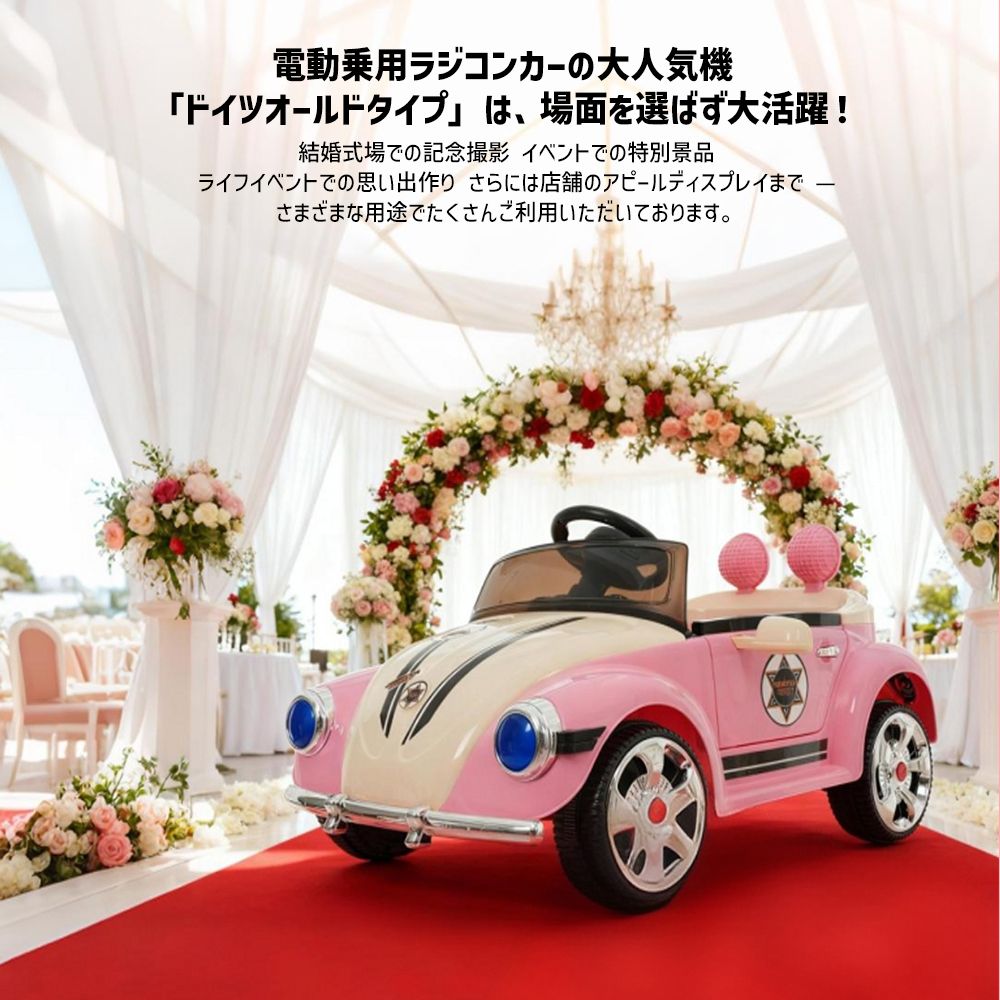 【電動乗用ラジコンカーの大人気機】「ドイツオールドタイプ」は、場面を選ばず大活躍!結婚式場での記念撮影イベントでの特別景品ライフイベントでの思い出作りさらには店舗のアピールディスプレイまで ??さまざまな用途でたくさんご利用いただいております。