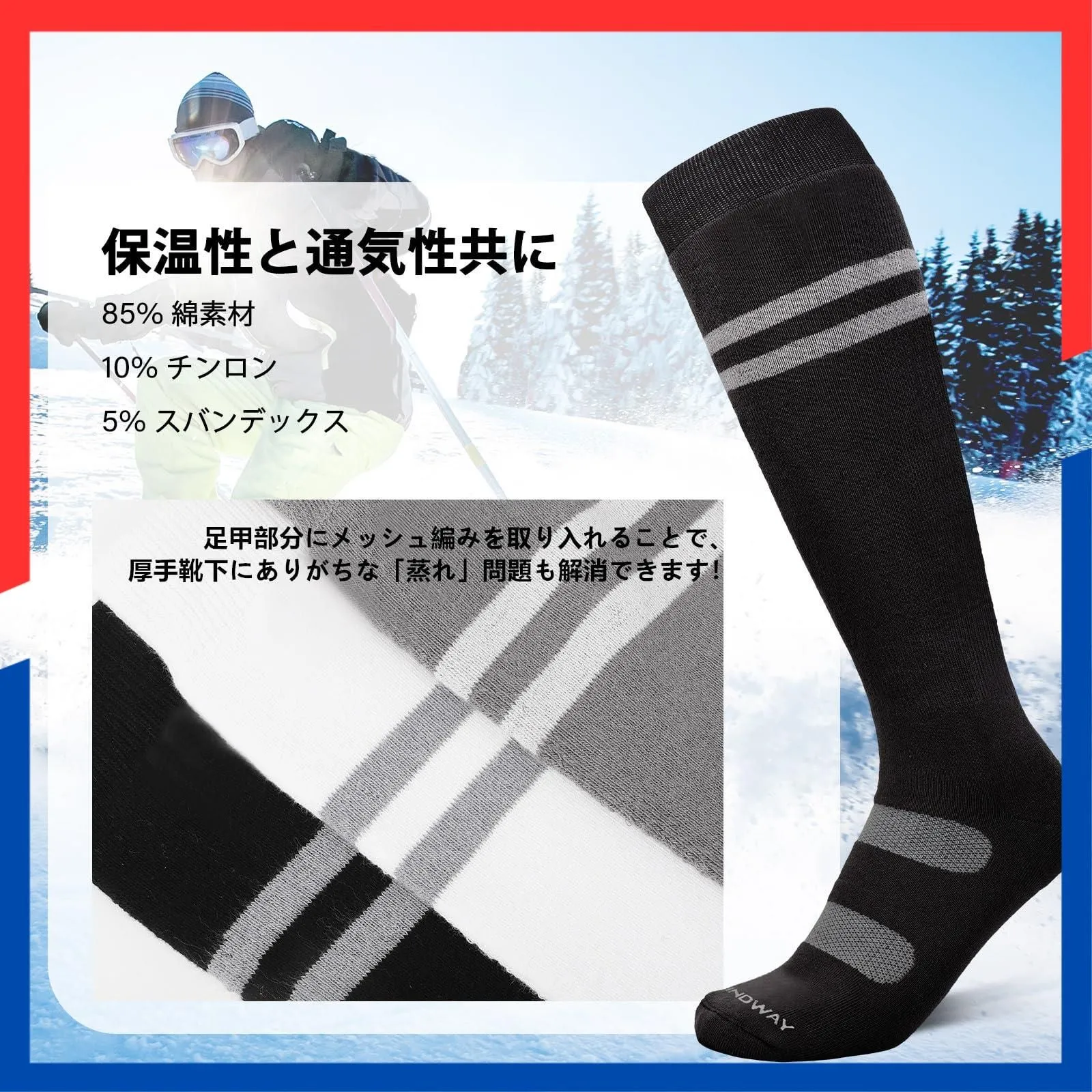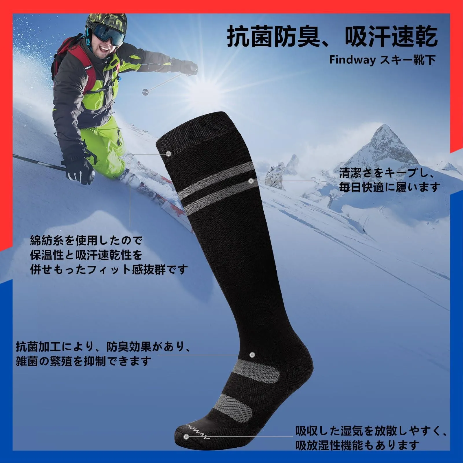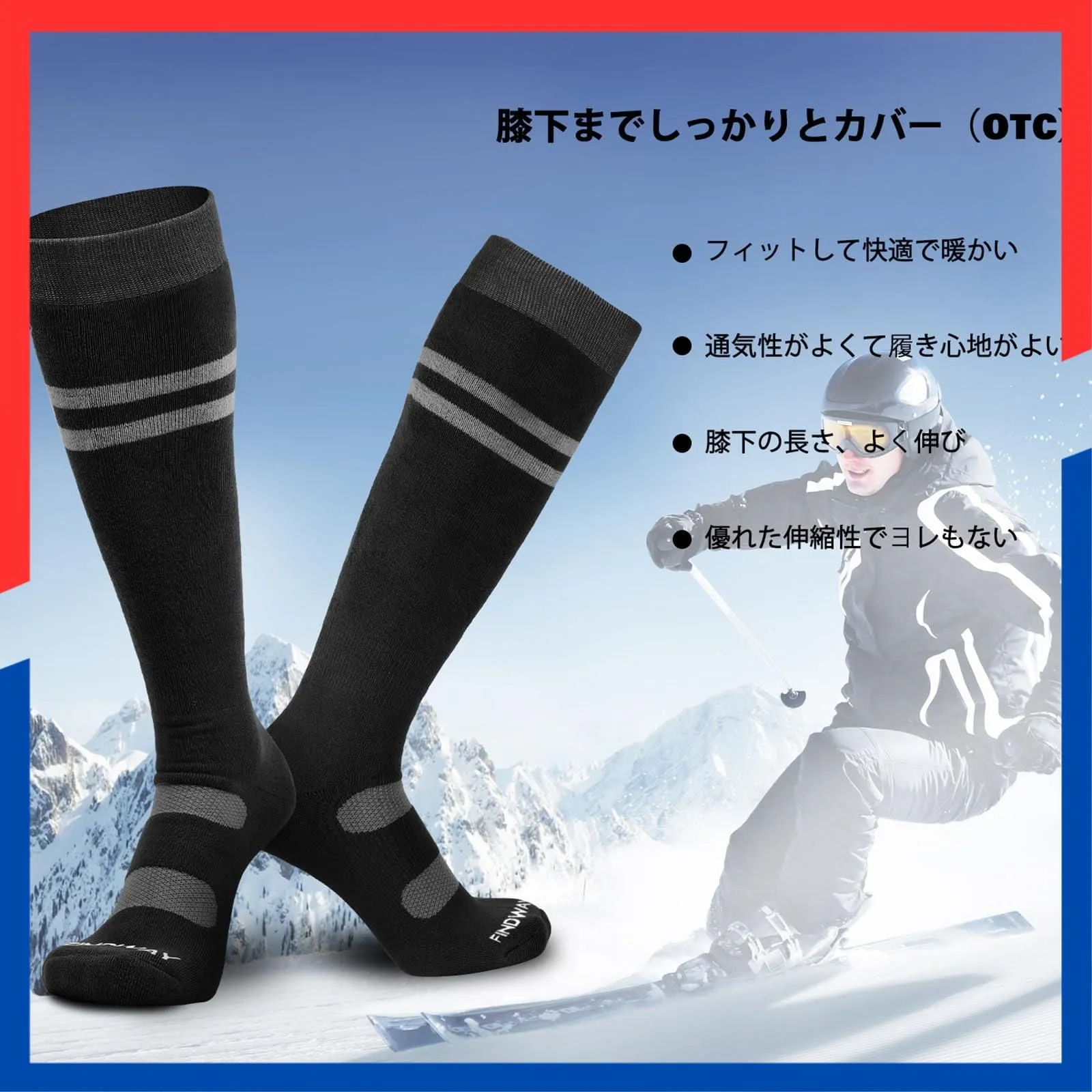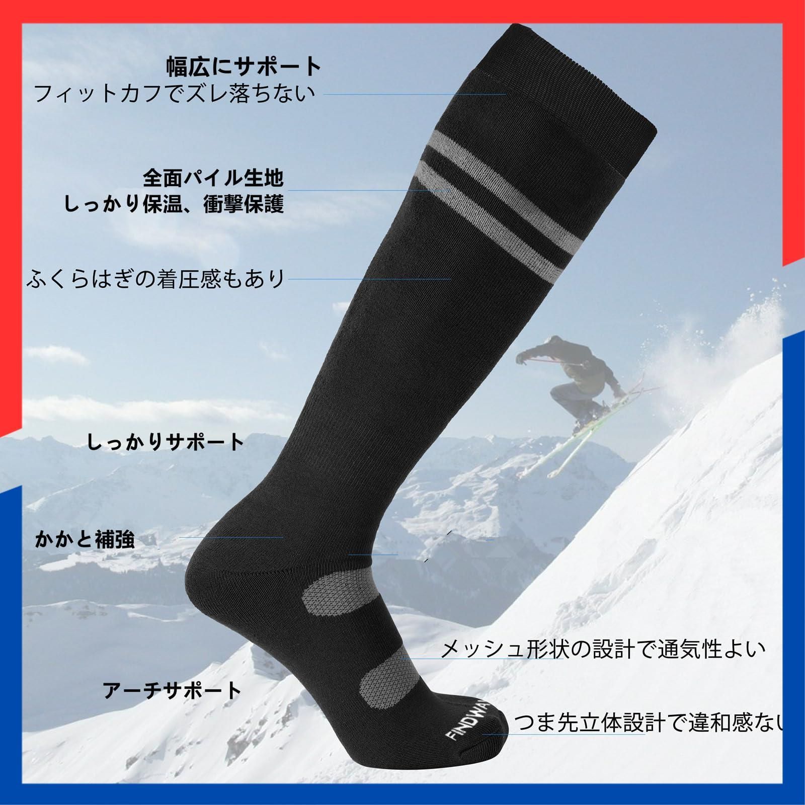 【サポート機能性バツグンでスノーボード・スキー用ソックス】Findway スキー靴下はオリジナルの進化版サポートタイプで、スキー、雪遊びなどのスポーツ用に開発いたしました。保温性と快適さを兼ね備えたスキーソックスは、足の形状に対応した立体構造+前傾姿勢シルエットや繊維原料にも「機能性」や「サポート力」を可能な限り追い込めまています。①「カフサポート」履き口が柔らかで伸びのよくきつくなく脱ぎやすいです。②「足首サポート」アキレス腱部分のサポートを重視し、スキーソックスのずれ込みを軽減しながら足全体にしっかりフィットし、安心して履かせられます。ふくらはぎ周りの筋肉をしっかりサポート、筋肉を安定させ負担を軽減できます。③「アーチサポート」土踏まずをサポート、靴下のたるみを軽減します。サポート機能が安定性をを向上しながら、スポーツ中のサポートを提供、スキー、スノーボード、富士登山やお路さん、山歩き、キャンプ、フェスなどのあらゆる冬のスポーツやアウトドアに最適です。
