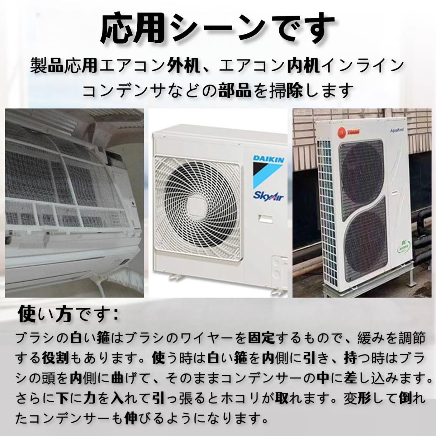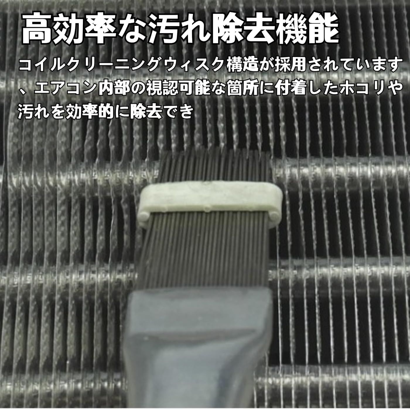【高効率な汚れ除去機能】本製品はエアコンフィン部の掃除専用ブラシで、コイルクリーニングウィスク構造が採用されています。プラスチック製フィンコームに比べ、挿入性と耐久性に優れ、エアコン内部の視認可能な箇所に付着したホコリや汚れを効率的に除去でき、掃除作業を大幅に簡略化します。