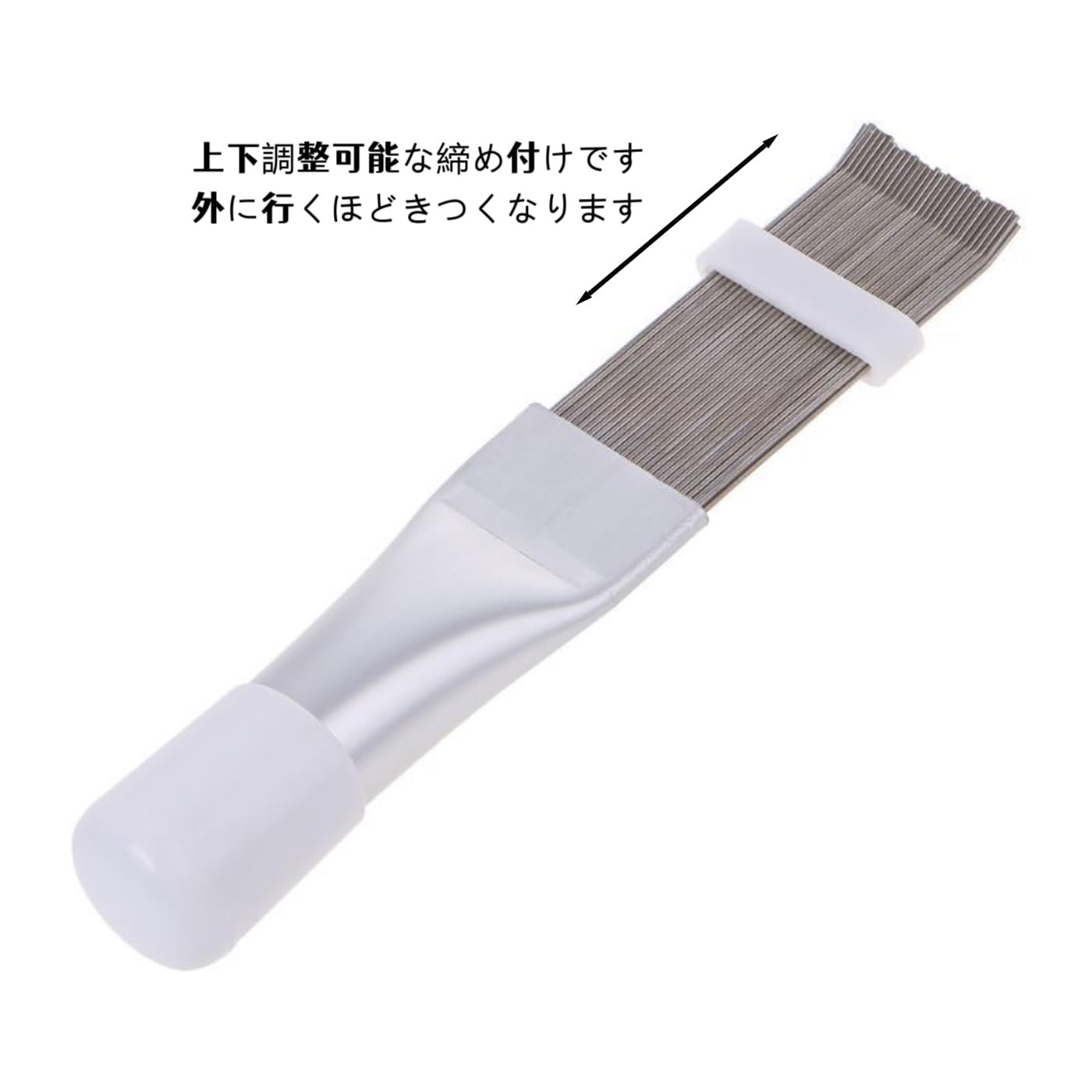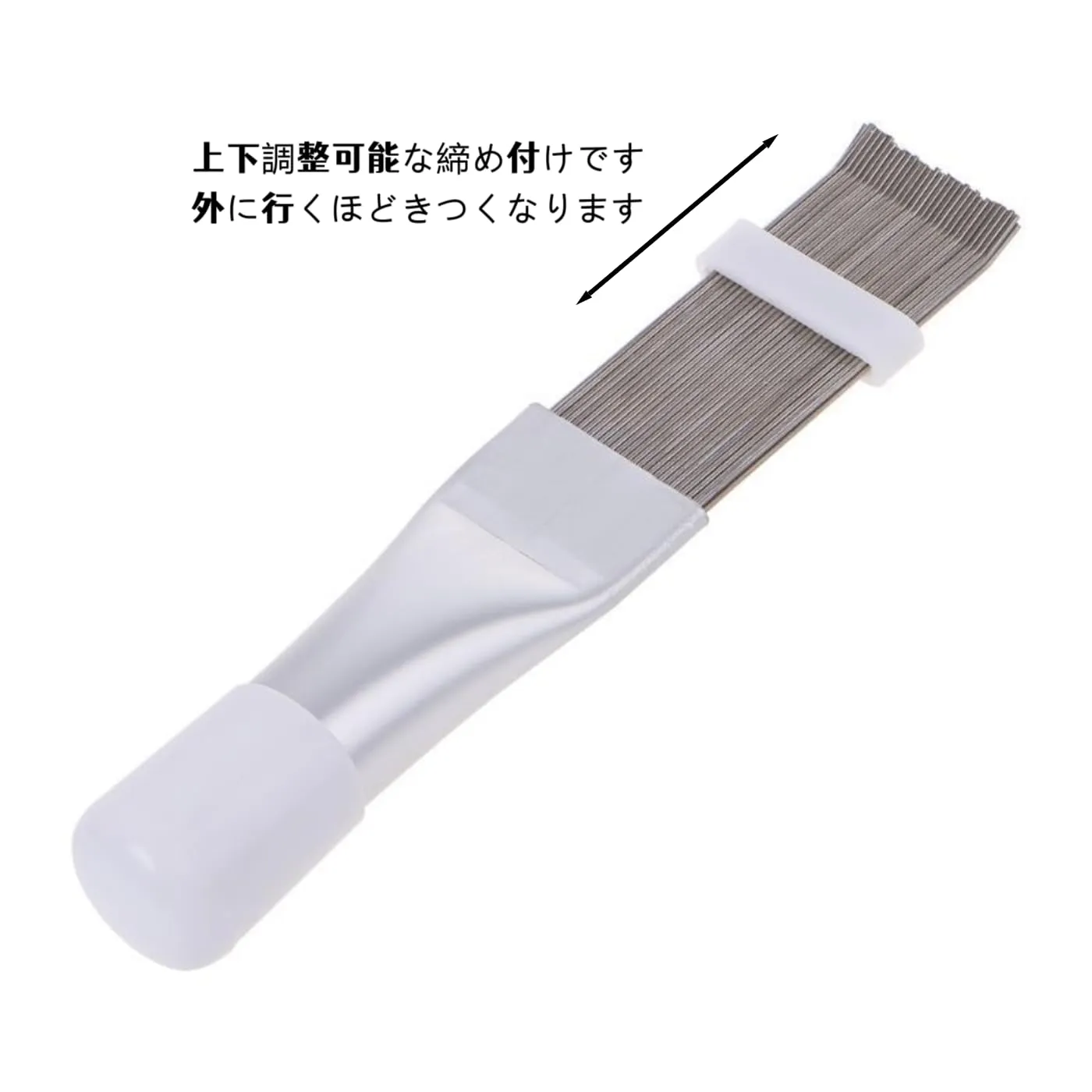 【使いやすさを重視した設計】フィンコームに付属するベルトをスライドさせることで、ブラシの硬さを自由に調整できます。エアコンの機種やフィンの形状に合わせて最適な硬さに設定可能で、適切な比率設計により掃除時の力を節約できます。また、十分な柔軟性を持たせることで、コイルの放射フィンを傷つけることなく安全に掃除できるよう配慮されています。
