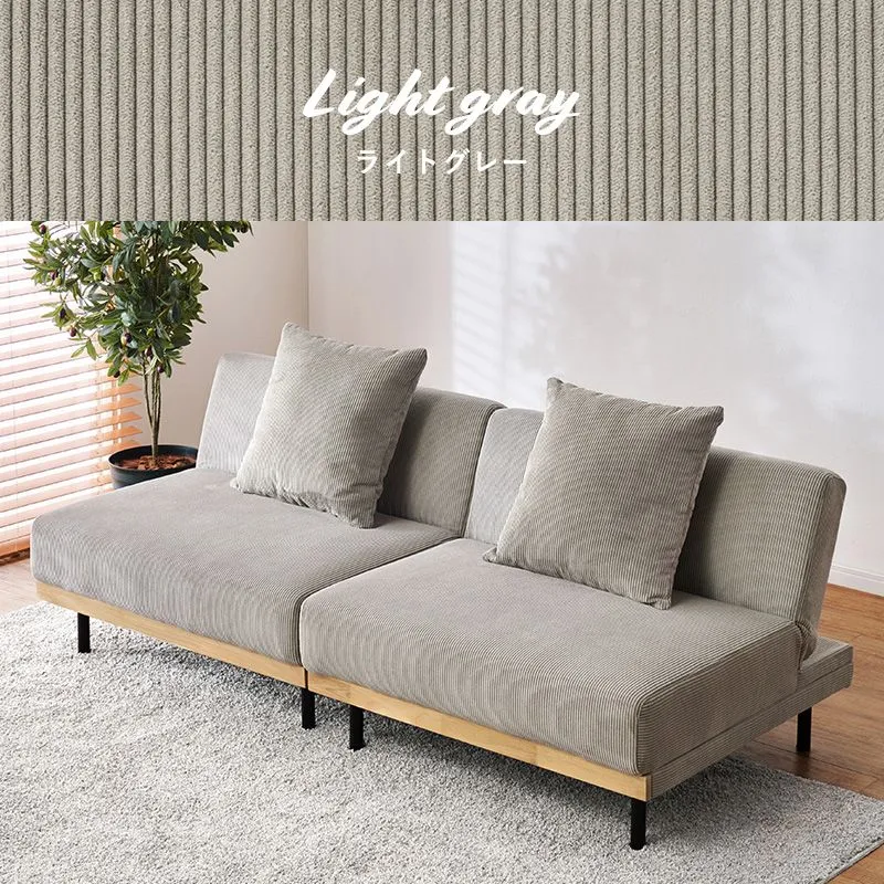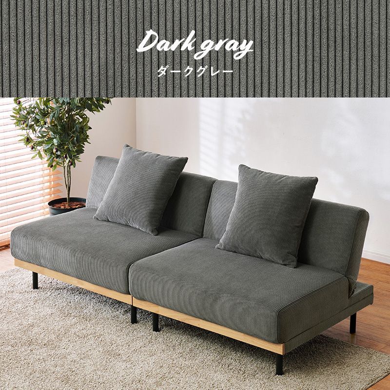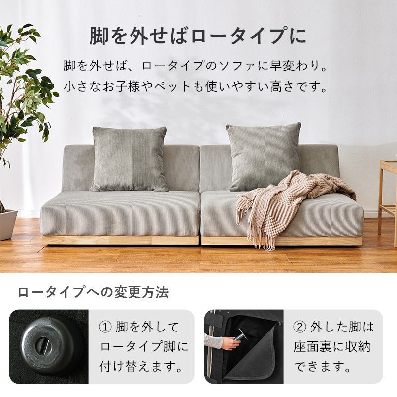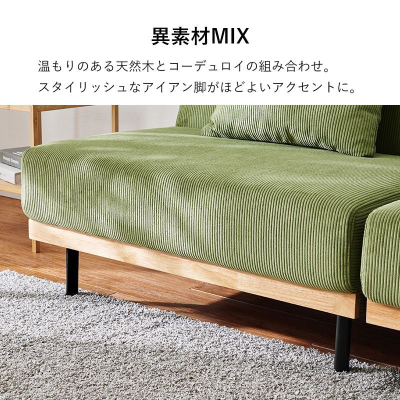 ソファの置き方次第で4つのくつろぎスタイルの使用が可能。コーデュロイ生地と温もりのある天然木、アイアンの脚を合わせたデザインです。