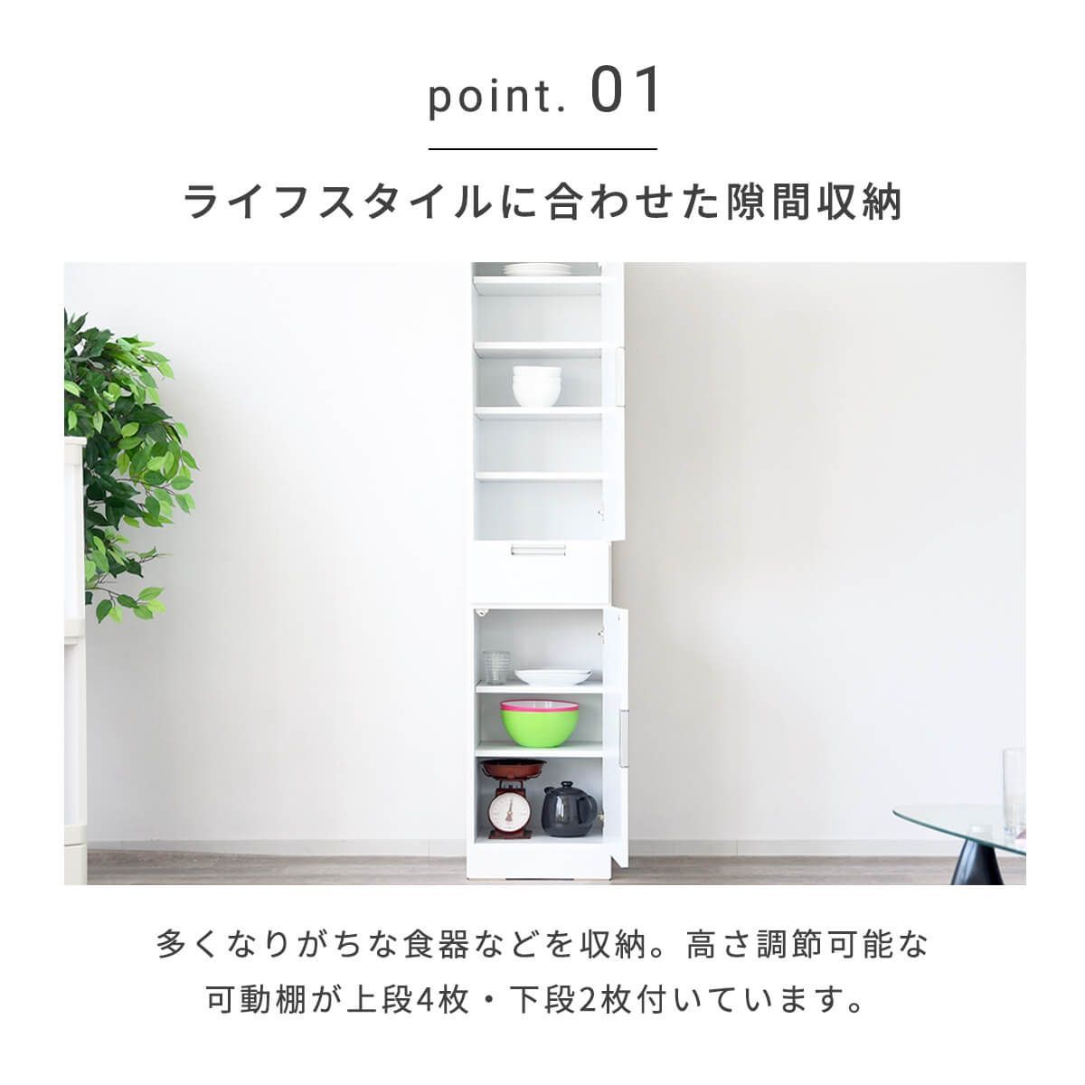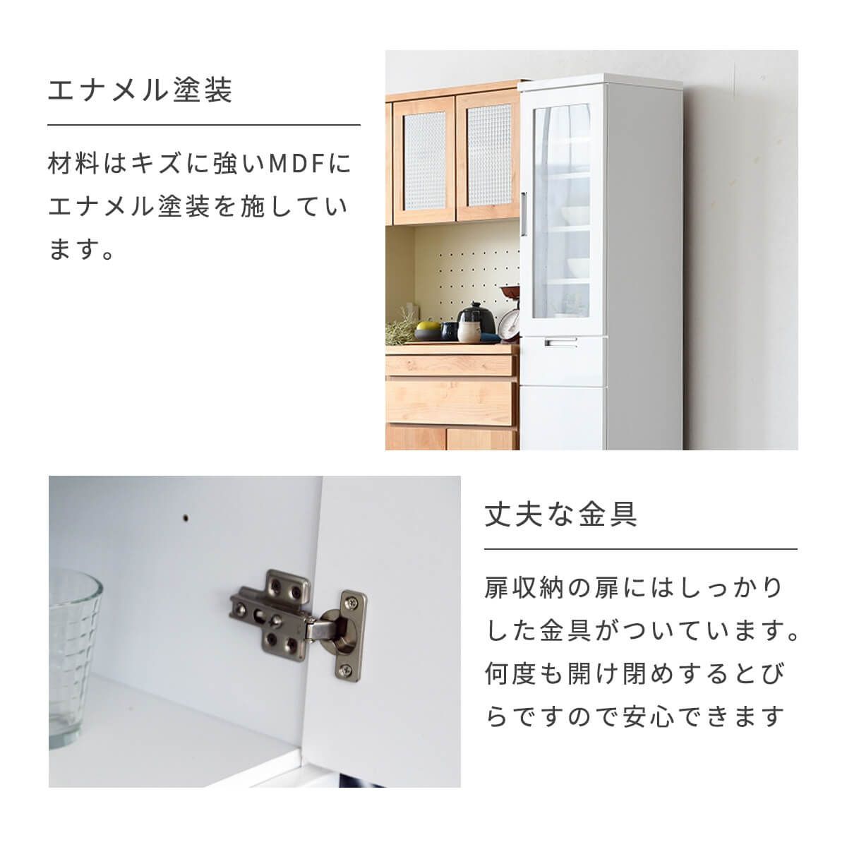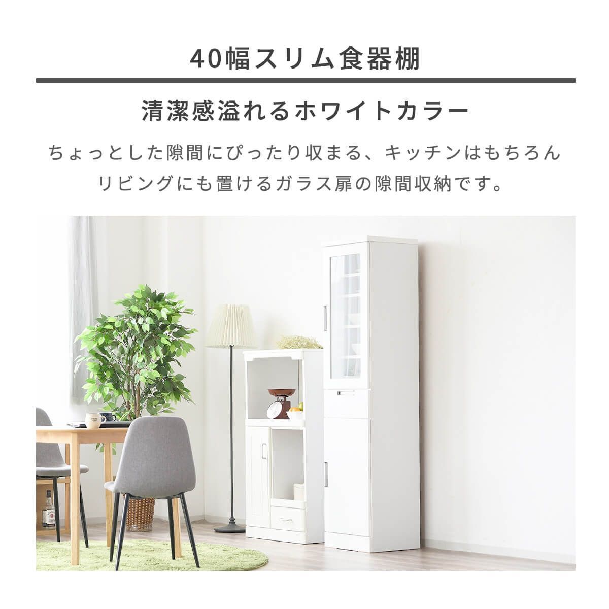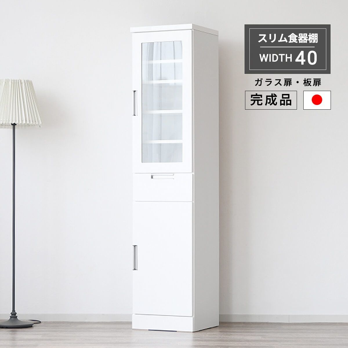 【新品】食器棚 隙間収納 幅40cm すき間収納 ガラス扉 板扉 引出し スリム ホワイト ハイタイプ エナメル塗装 鏡面 白 可動棚 コンパクト シンプル モダン 北欧 日本製 完成品 幅40 「商:大」 「才:12」