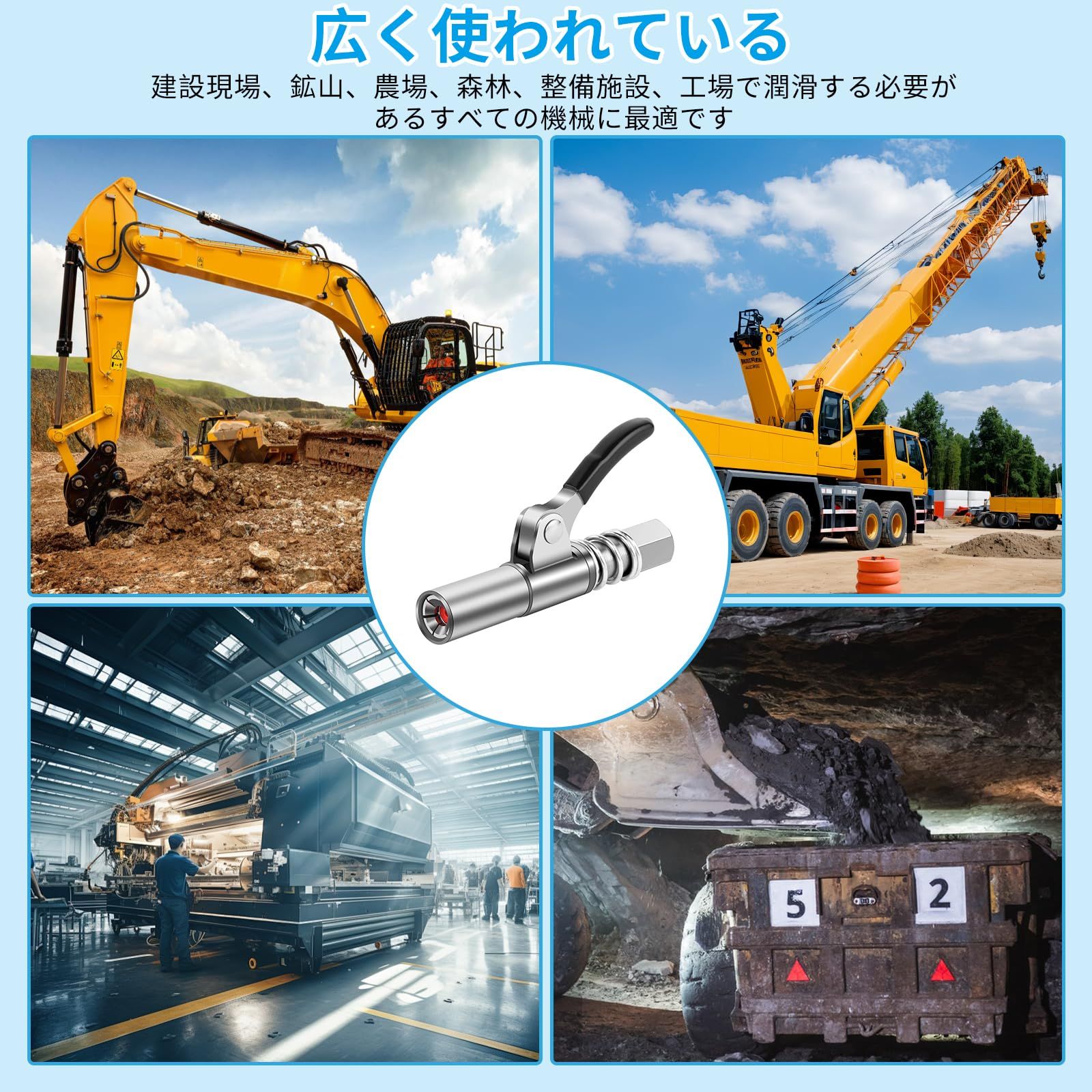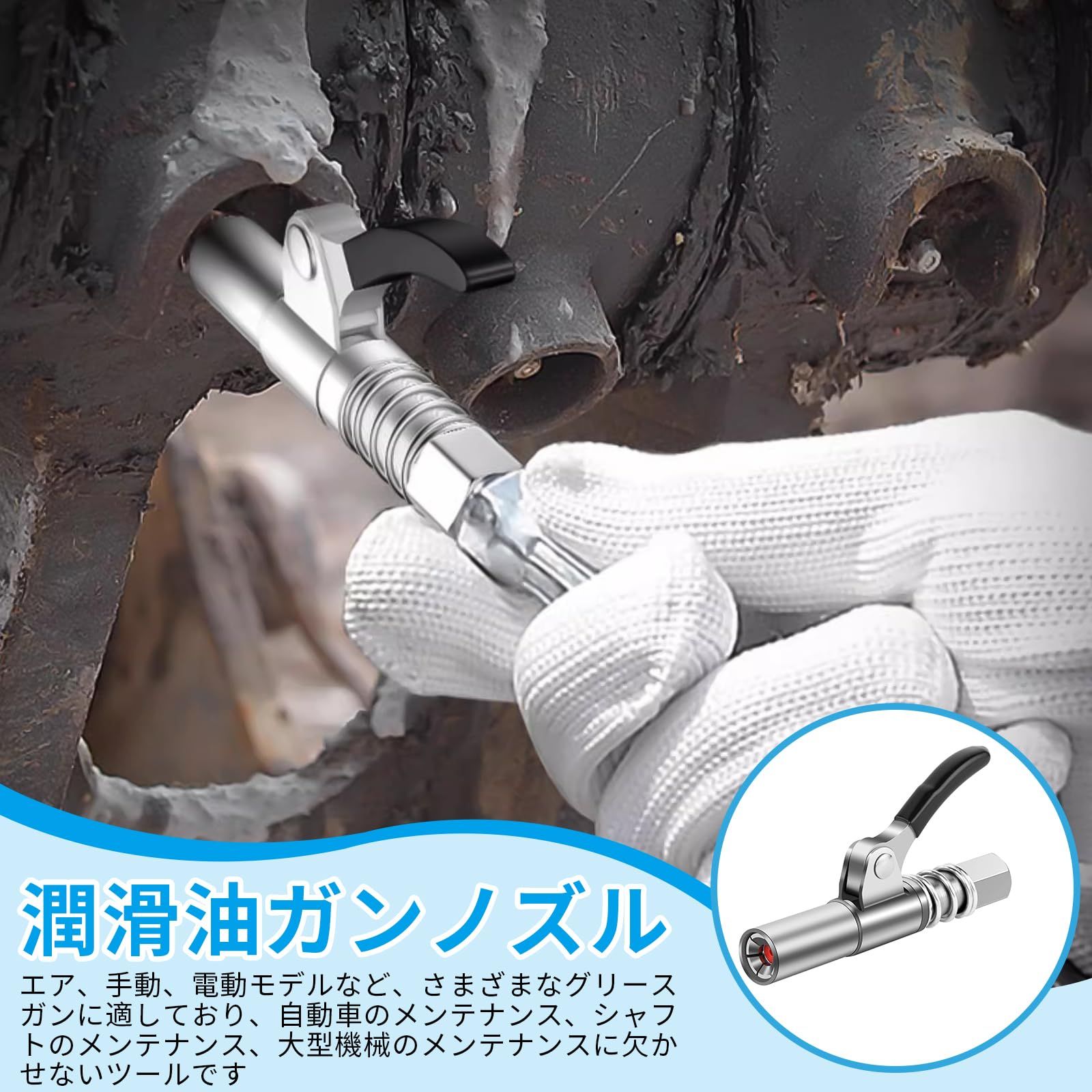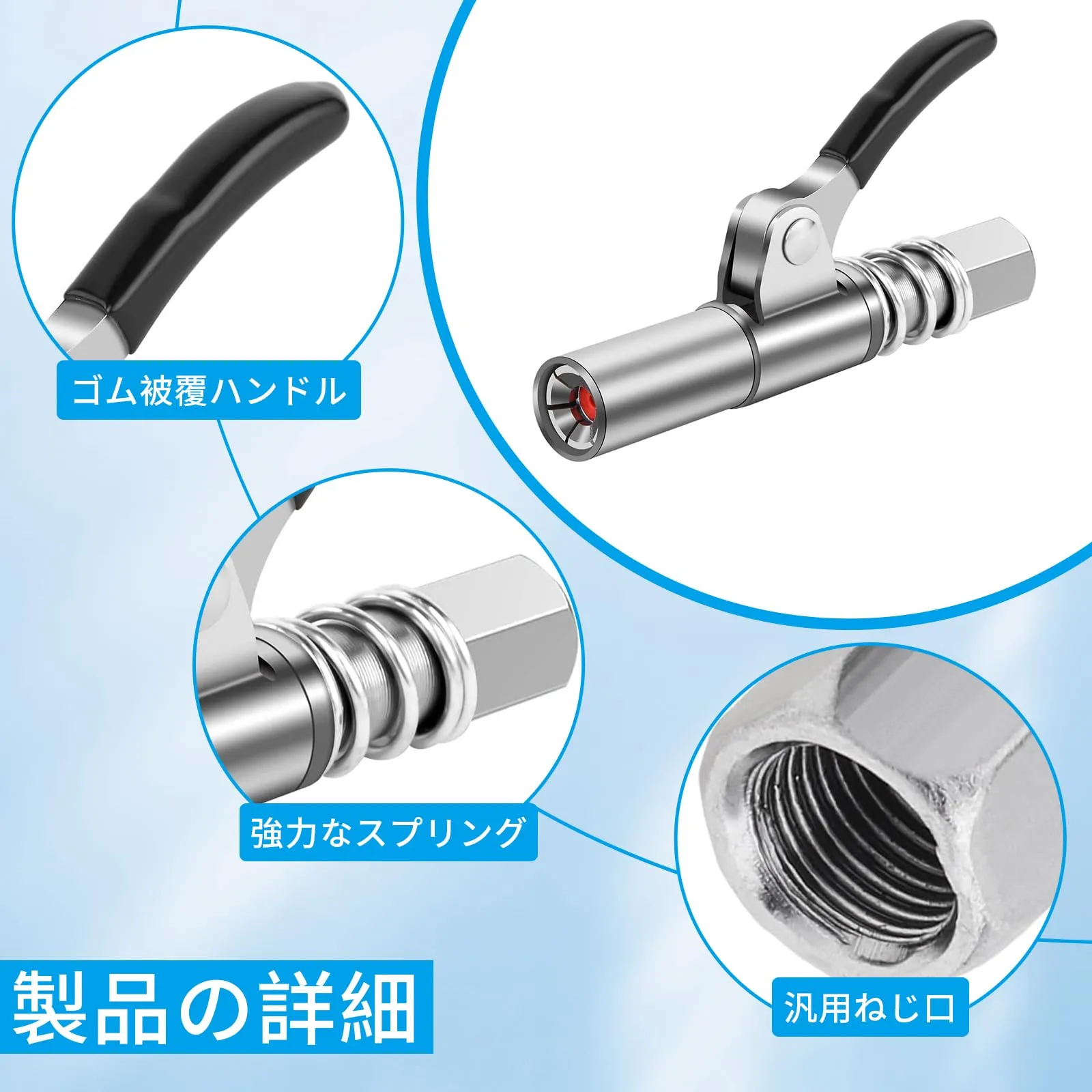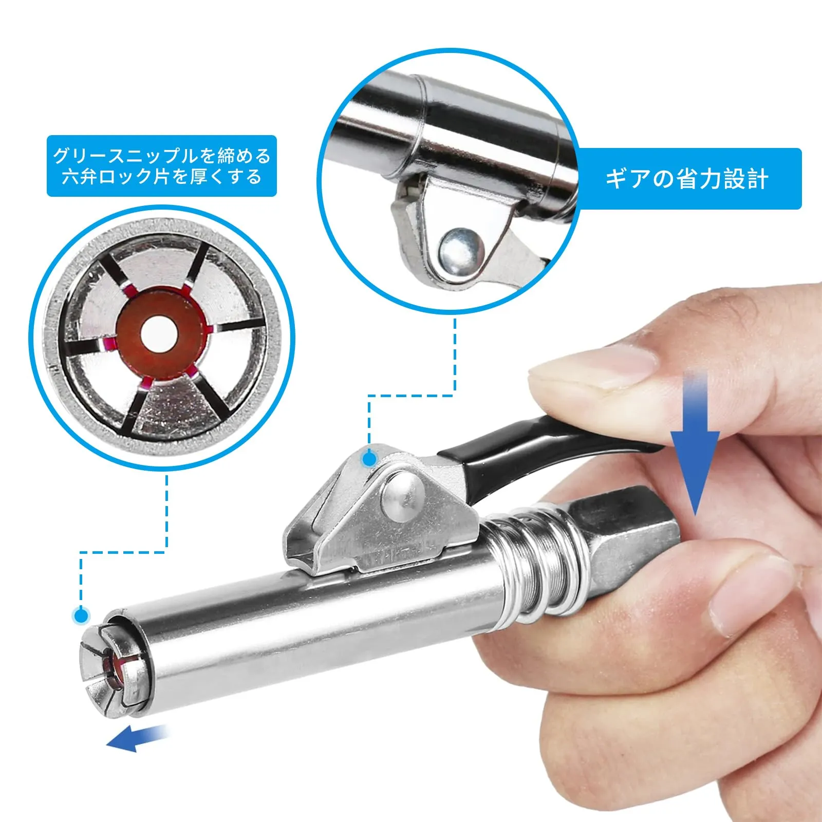 【簡単に取り付け】本体のレバーを引きながらグリースニップルに押し込むことで簡単に取り付けることが可能です。また、取り外しの際も、本体のレバーを押さえると圧力が抜け、簡単に取り外すことができます。ワンタッチで操作が可能なので、非常に使いやすいです。