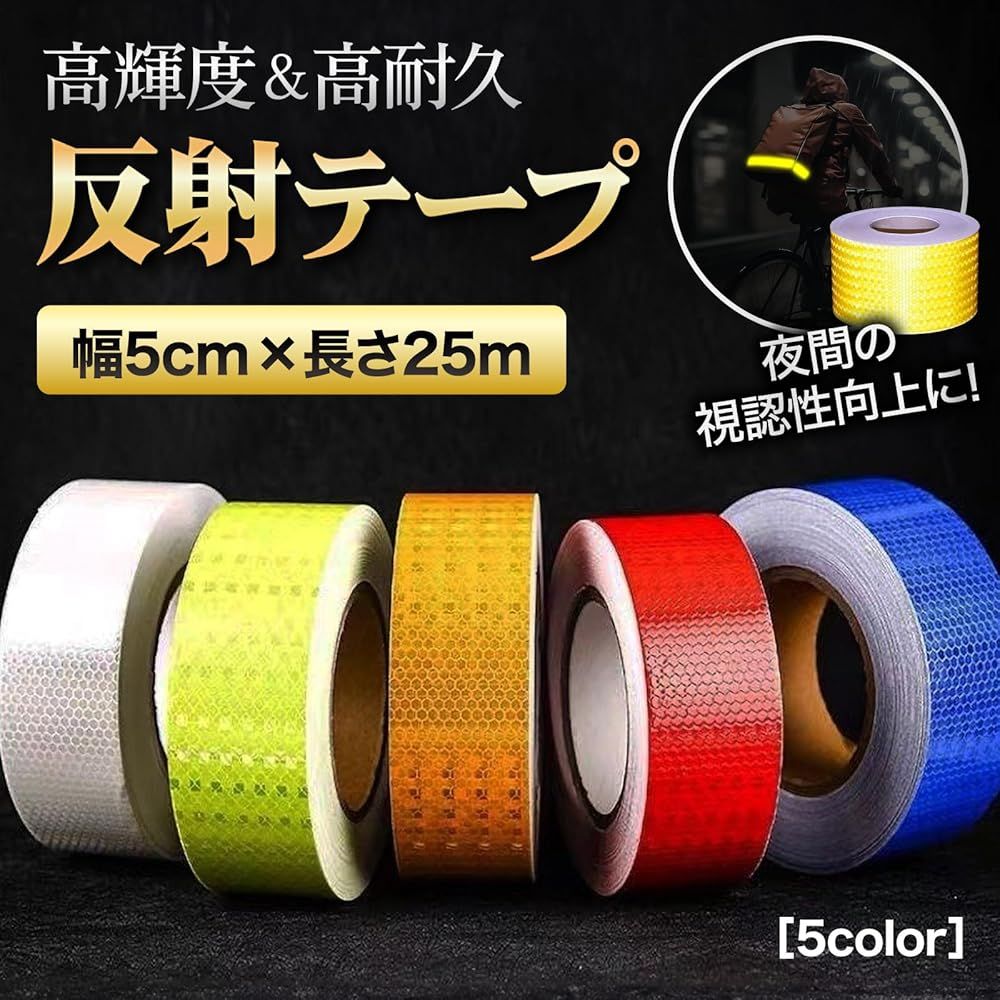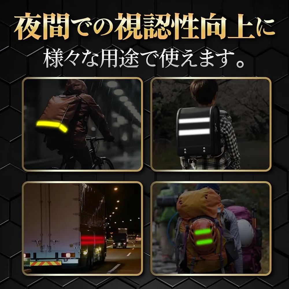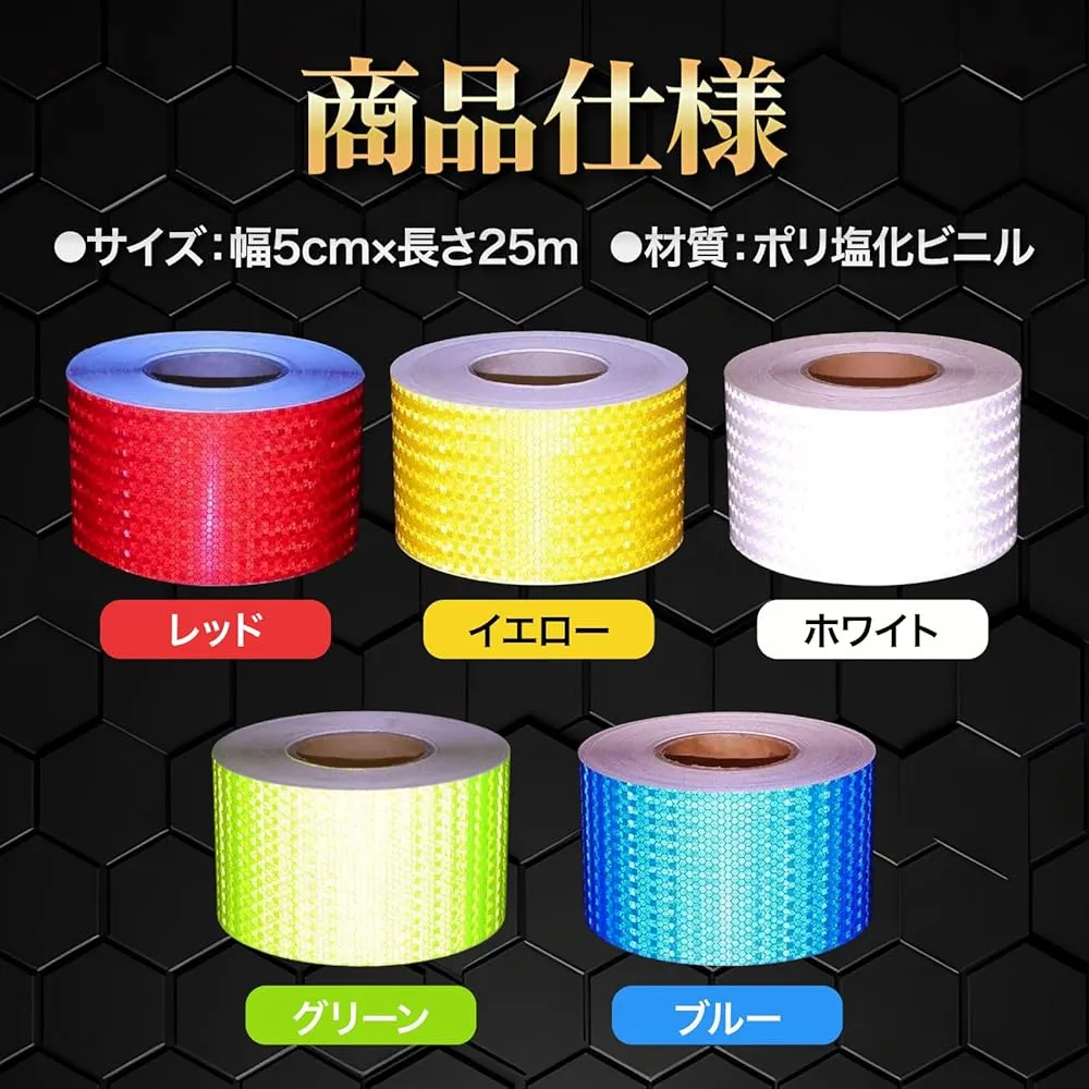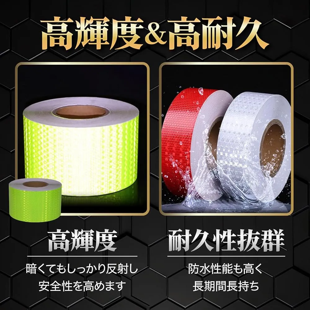 【商品詳細】 テープ長さ:約25m テープ幅:約5cm、素材:PVC ※高輝度反射テープは、暗闇でも強力な反射力を発揮し、夜間の安全性を確保します。駐車場や道路のラインマーキング、車両、バイク、自転車、ヘルメット、ランドセル、郵便箱、フェンス、歩道、階段など、あらゆる場所に簡単に貼り付けてご使用いただけます。 「高輝度反射テープ - 車用防水ステッカー」 この高輝度反射テープは、車や自転車、オートバイに最適な防水ステッカーです。耐水性に優れ、屋外での使用に最適。粘着力が強く、コンクリートやブロック塀にも簡単に貼り付け可能。夜間の交通安全を確保する反射材として、駐車場や道路のラインテープとしても活躍します。滑り止めテープとしても利用可能。 「反射テープ - 車用安全シール」 この蓄光反射テープは、車や自転車、オートバイに最適な安全シールです。防水テープ仕様で、屋外でも安心して使用可能。高輝度の反射効果により、夜間の視認性を向上。コンクリートやブロック塀にも貼り付けやすく、駐車場や道路の反射ステッカーとしても活躍します。 「反射テープ - 屋外用防水反射シート」 車や自転車、オートバイに最適な屋外用防水反射シートです。高輝度の反射材を使用し、夜間の交通安全を確保。耐水性が高く、コンクリートやブロック塀にも強力に粘着。駐車場や道路のラインテープ、反射ステッカーとして幅広く利用できます。滑り止めテープとしても機能。 「蛍光反射テープ - 車用パワーテープ」 この蛍光反射テープは、車や自転車、オートバイに最適な蛍光パワーテープです。防水・耐水仕様で、屋外でも安心して使用可能。高輝度の反射効果と蛍光機能により、夜間の視認性を向上。コンクリートやブロック塀にも簡単に貼り付け可能で、駐車場や道路の反射シールとしても活躍します。
