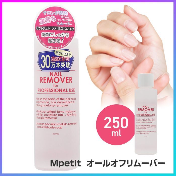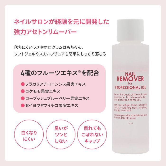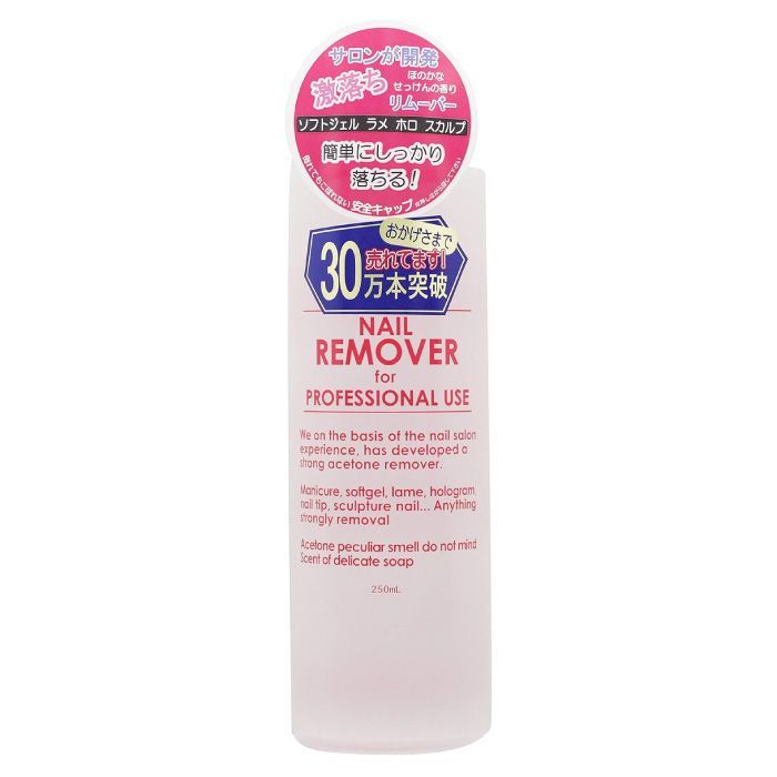 【250ml】 ネイルサロンが経験をもとに開発した強力アセトンリムーバー。 落ちにくいラメやホログラムも簡単にしっかり落ちる。 ほのかなソープの香りでアセトン特有の匂いも気になりません。 倒れてもこぼれにくい安全キャップ