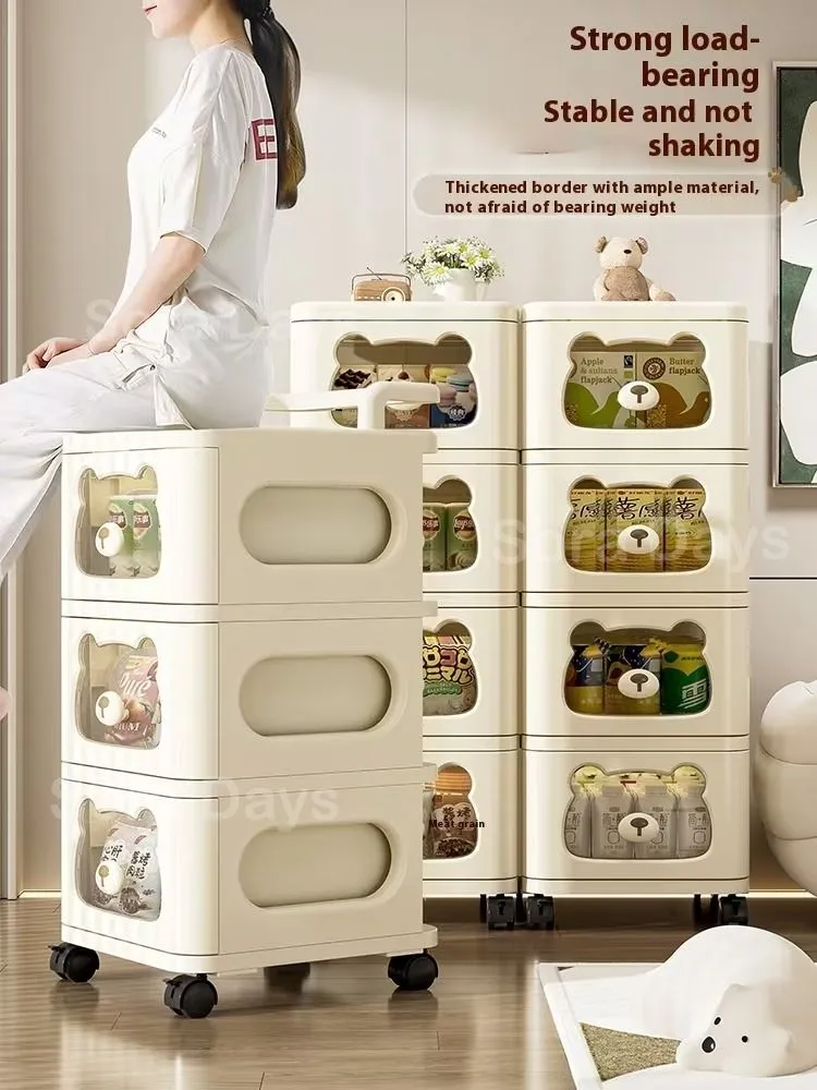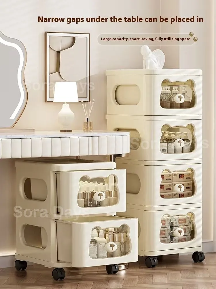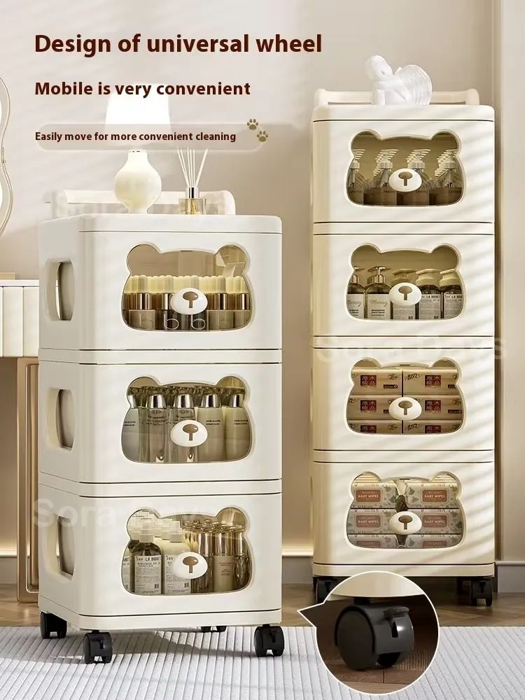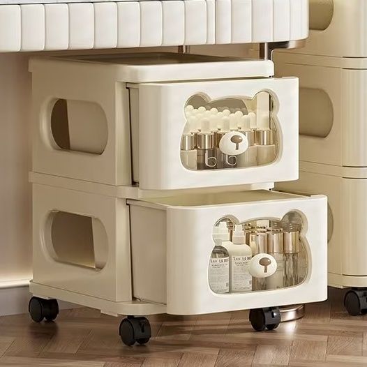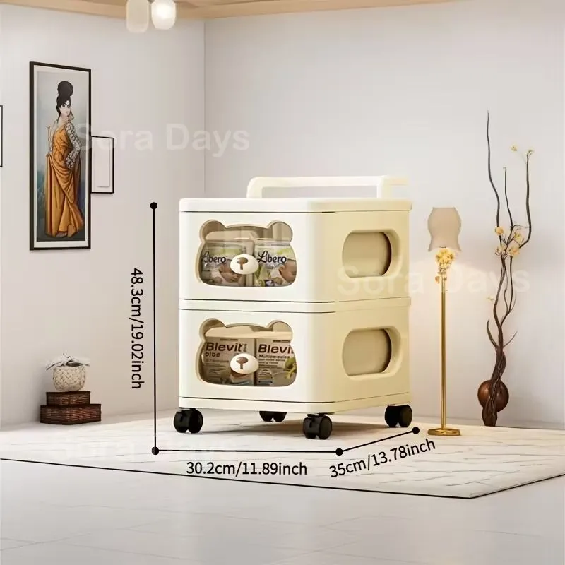 チェスト キャビネット クマの顔の窓 引き出し2段 キャスターワゴン 可愛い おしゃれ インテリア 北欧 収納 中身が見える クリーム色 プラスチック 30.2×35×48.3cm