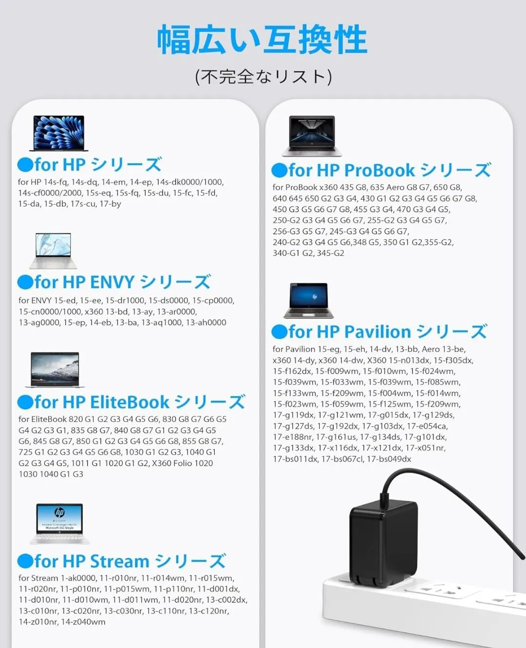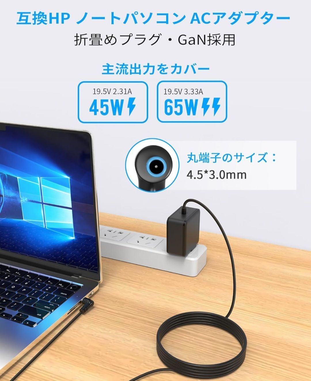 【新素材GaN+採用の65W HP用 充電器】本製品は小型化、軽量化した持ち運び向けのHP用ノートパソコン 充電器です。このHP用 ACアダプターはGaN+窒化ガリウム素材を採用することによって、デカすぎるの純正HP用 スマートACアダプターより余程軽量化且つ小型化を実現できましたの一方、充電も低発熱と高効率化しています。