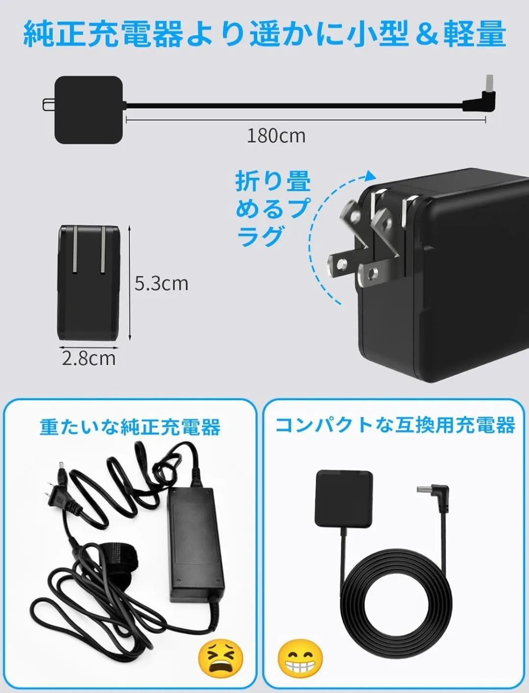 【ケーブルと一体型・小型&軽量・持ち運び便利】このHP用 電源アダプターはミニサイズのデザインの上、ACプラグも折り畳める設計のため、小さいに収納できて持ち運び便利です。それに充電ケーブルと一体型の設計で別に配線不要、非常に使い勝手が良くて、通勤や通学、出張、旅行などに不可欠なHP用ACアダプターです。