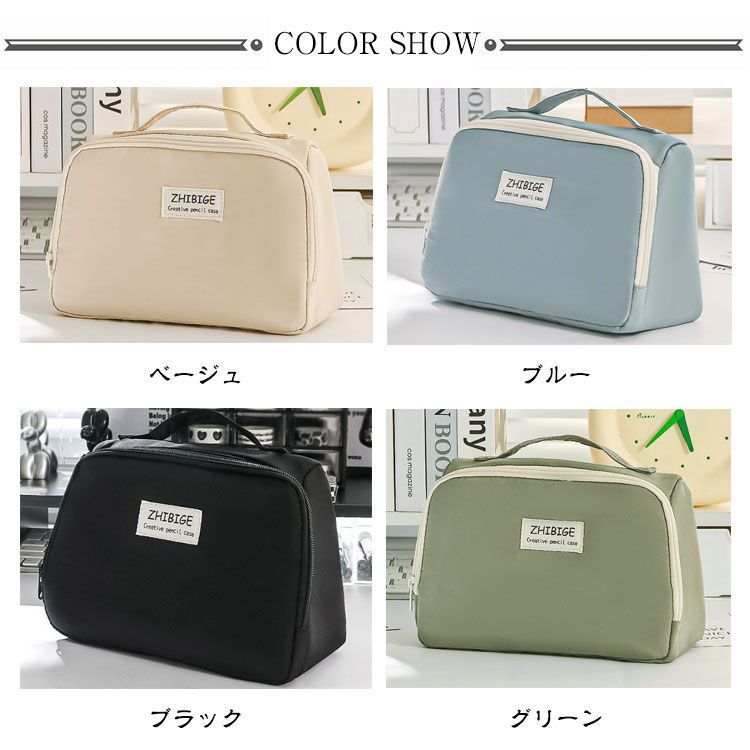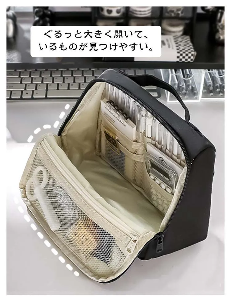 ■沖縄・離島は配送料が異なります。ご購入前にコメントをお願いいたします。 商品仕様 - サイズ:F (約230mm × 90mm × 170mm) - 素材:帆布 - カラー:ベージュ、ブルー、ブラック、グリーン 特徴 - 自立式デザイン:文房具を立てて収納できるため、中身が一目で把握でき、机上でも省スペースで整理できます。 - 大容量&広開口:手帳も収まる大容量。ぐるっと大きく開くので、中のものが探しやすくなっています。 - 便利なポケット:小さな小物も見失わないメッシュポケット付き。 - 携帯性:持ち手付きで、持ち運びに便利です。 - 整理・収納に最適:ペン、電卓、文具などの仕事道具をまとめて収容・携帯できるため、準備や片付けが簡単です。 - 多用途:化粧ポーチとしてもご利用いただけます。 ※サイズは手作業で計測しているため、若干の誤差が生じる場合がございます。