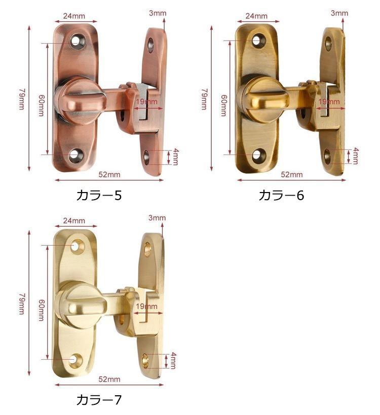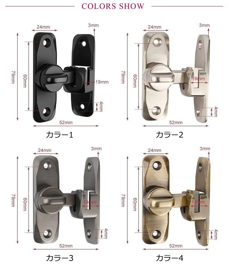 ■沖縄・離島は配送料が異なります。ご購入前にコメントをお願いいたします。 商品仕様 - サイズ:90度-180度兼用 - 素材:亜鉛合金 - カラー:全7色(カラー1〜7) 商品の特徴 - 回転式で90°と180°の両方に対応する後付けドアロックです。 - ネジでしっかり固定する丈夫な構造で、長持ちします。 - 簡単に取り付け可能。開き戸や引き戸など、様々なドアにご使用いただけます。 - お子様のいたずら防止やペットの脱走防止に効果的です。 - 防犯対策、トイレや個室のプライバシー保護、追加内鍵としてもお使いいただけます。 - スライドドアの簡易施錠や、猫の脱走防止にもご利用できます。