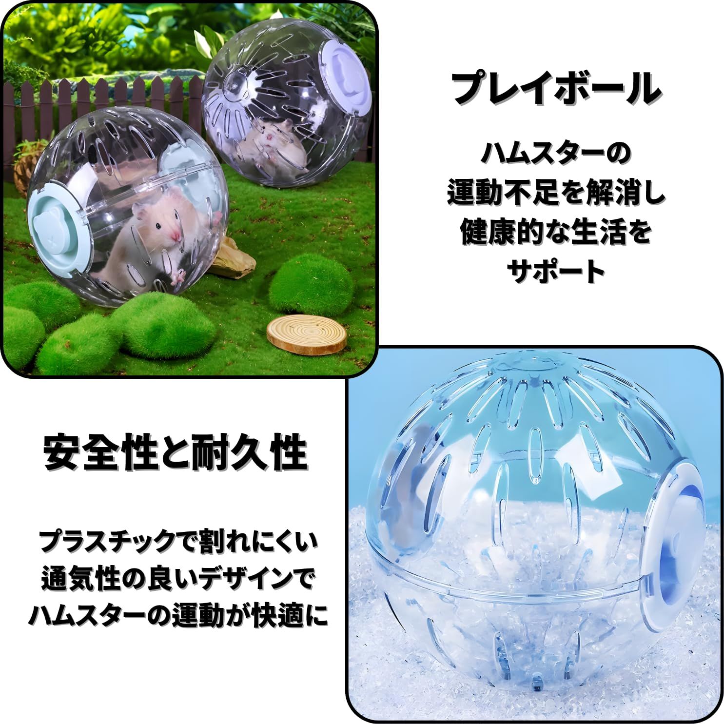 【ハムスタープレイボール】このプレイボールは、ハムスターの運動不足を解消し、健康的な生活をサポートします。透明度が高く、ハムスターの動きを観察しながら安心して遊ばせることができるため、飼い主も楽しめます。
