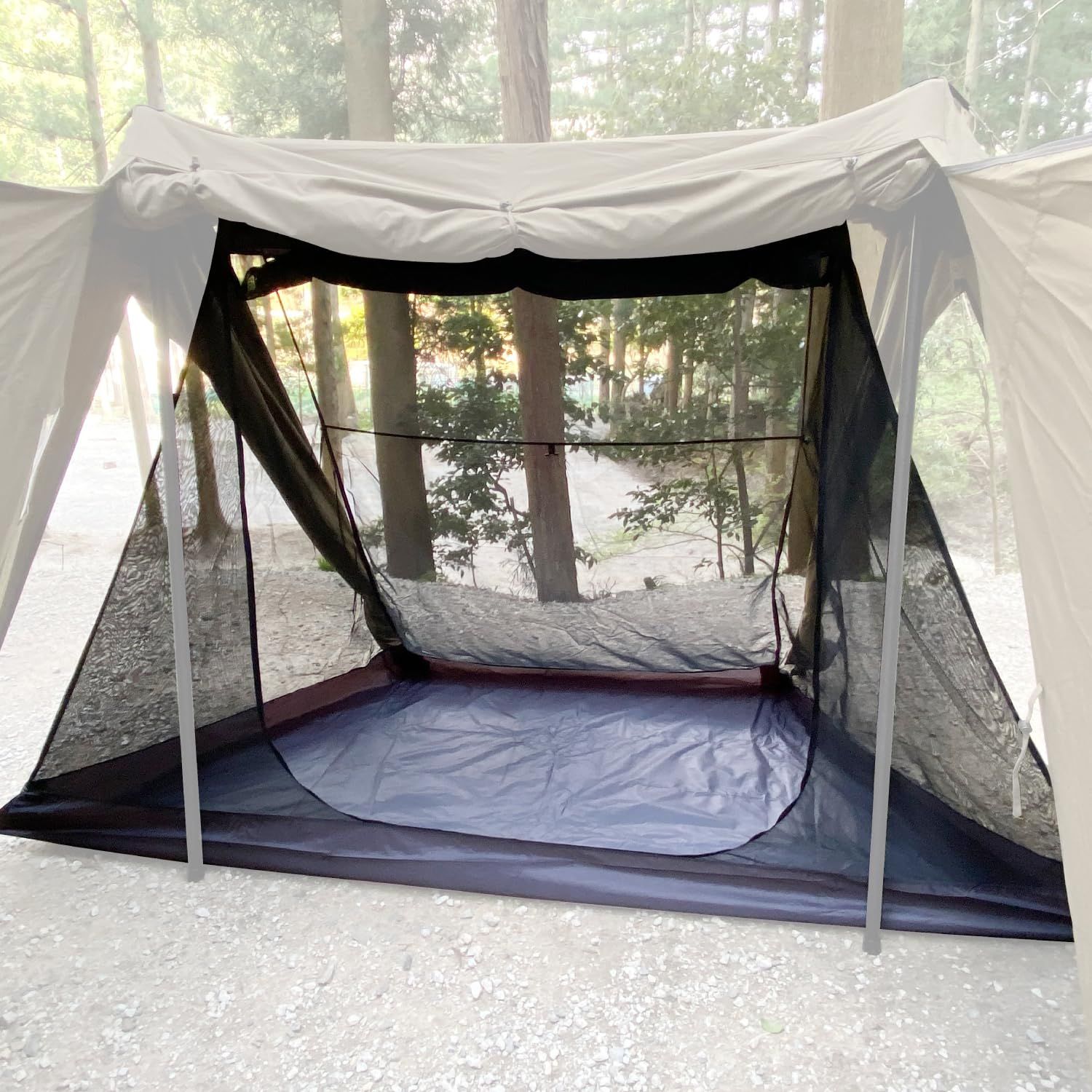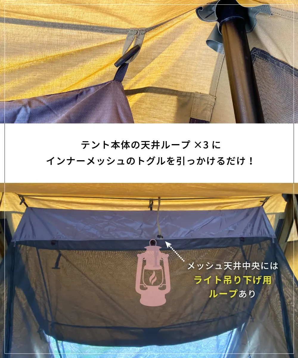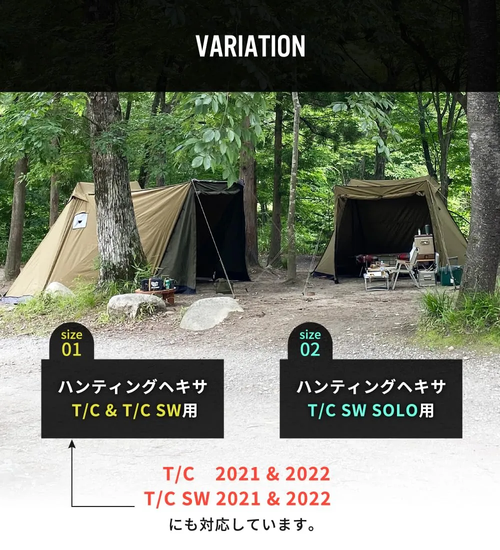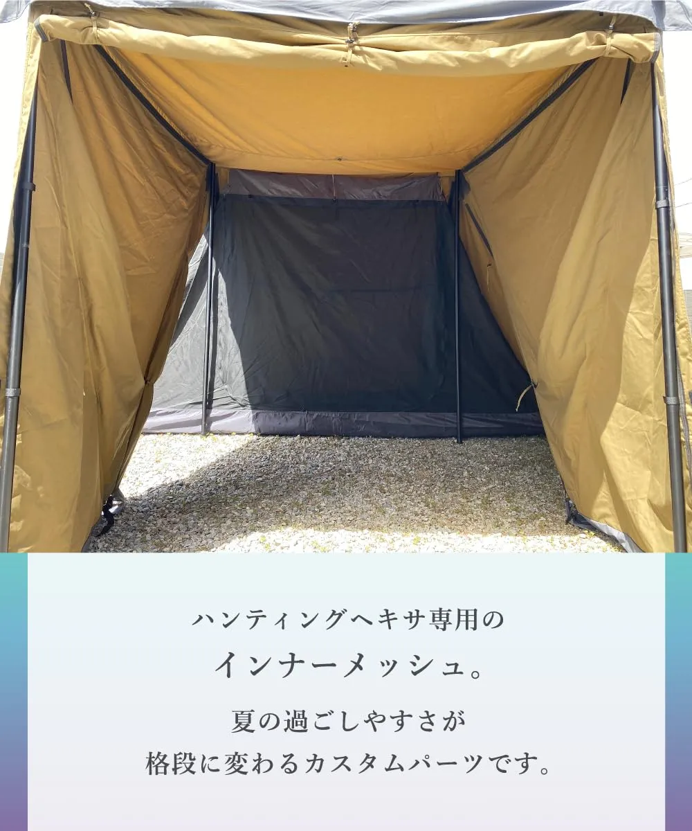 ■収納袋×1 ”星空が見えるテント” ハンティングヘキサSOLO専用のインナーメッシュ。 夏の過ごしやすさが格段に変わるカスタムパーツです。インナーメッシュ内にはハイコット1台設営可能です。 設営方法は簡単!テント本体の天井ループ×3にインナーメッシュのトグルを引っかけるだけ! メッシュ天井中央にはライト吊り下げ用ループあり。 <ハンティングヘキサ T/C SW> ”星空が見えるテント” 天井が吹き抜けになる「スタービュー」で、解放感と基地感を同時に味わえるテント。 六角形の室内は幅384×奥行333cmと広々サイズ。 1人はもちろん、2~3人で過ごしてもOK。 SW(シェルターウォール)=前幕は、巻き上げれば解放感を味わうことができ、垂らせばプライベート空間を確保できます。 ホームプロジェクターを使えば、前幕に映像を映し出して簡易映画館に! キャノピー専用のアルミポール付き。 フライシート・スカートには「T/C(ポリコットン)」素材を使用。 丈夫でシワになりにくいポリエステルの特徴と、通気性・吸湿性が高いコットンの特徴の両方を兼ね備えています。 糸に撥水加工を施してから編み立てを行っており、防水性をさらにUP。 窓は「共生地(TC素材)窓」「透明窓」「煙突窓」の3種類が付属しています。 通気性を考慮し、ベンチレーションは左右丈夫に1つずつ。 本体内側にはポールのズレを軽減させるポールカップが縫い付けられています。 ≪サイズ≫