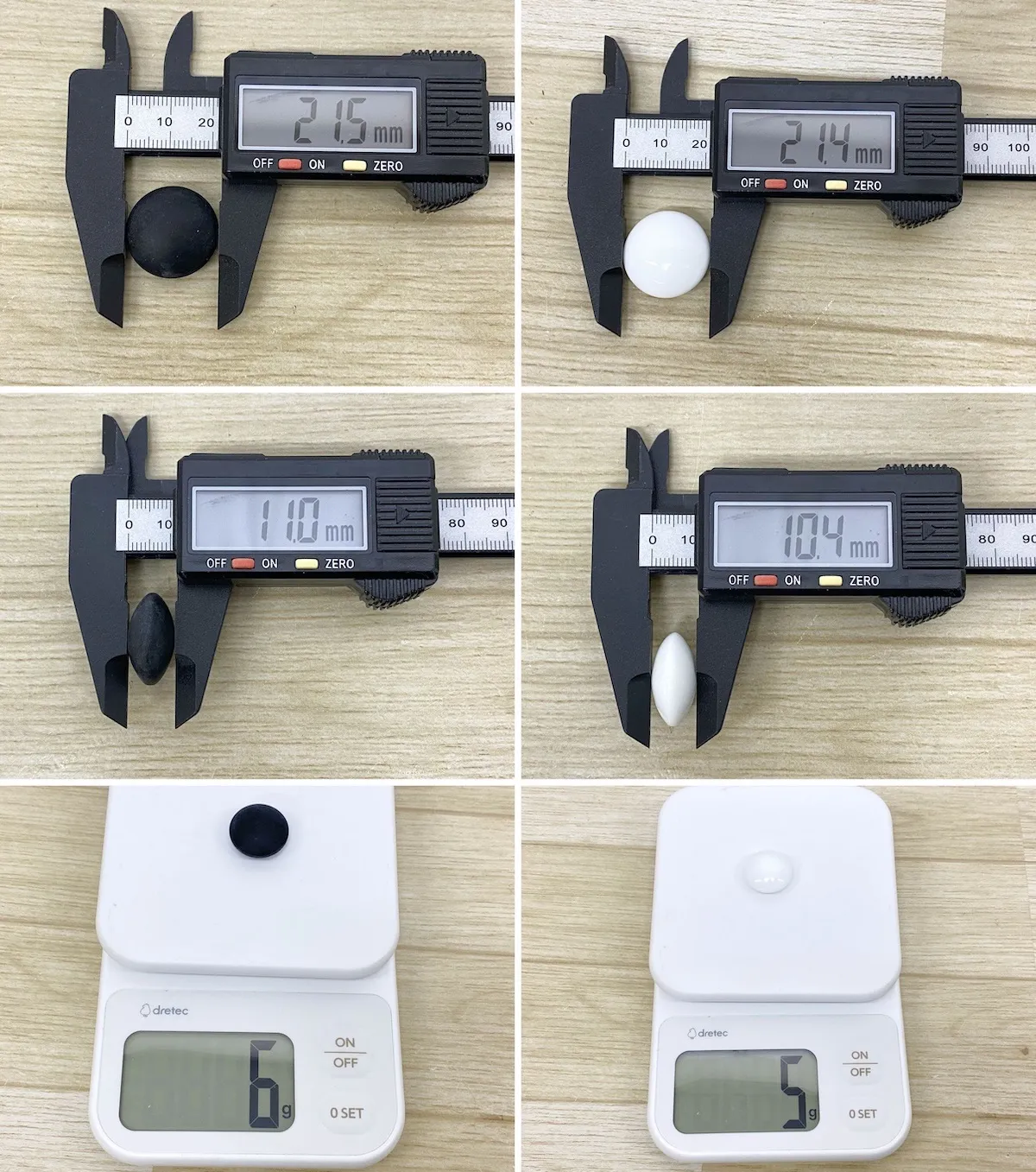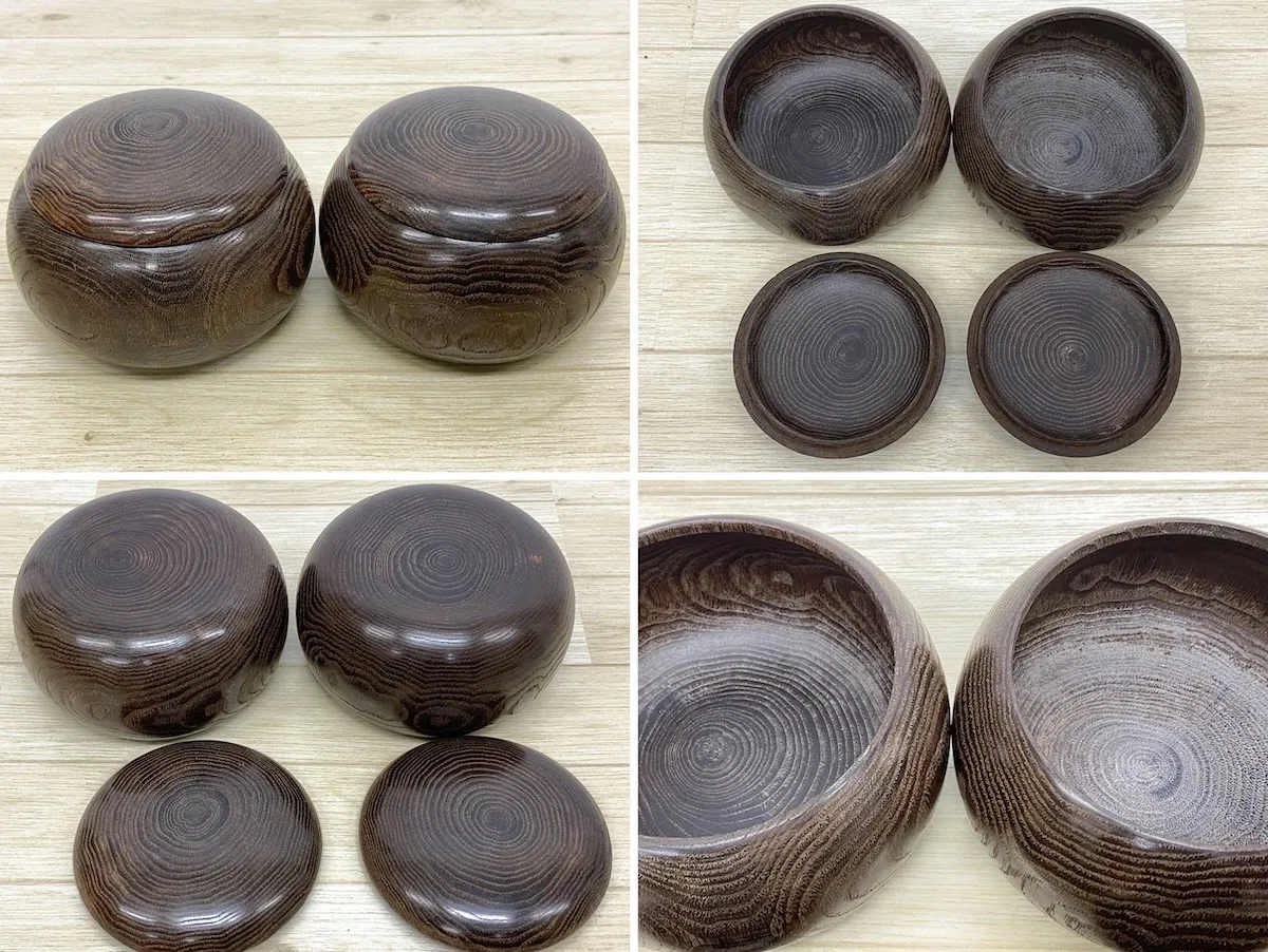 ■寸法(最外形実寸概ね 約) ・碁盤(折畳時)=約45cm×21cm×4cm ・木製碁笥=直径約13.5cm 高さ約9cm ・碁石(黒)=約21.7mm×11mm (181個) ・碁石(白)=約21.4mm×10.4mm (180個)