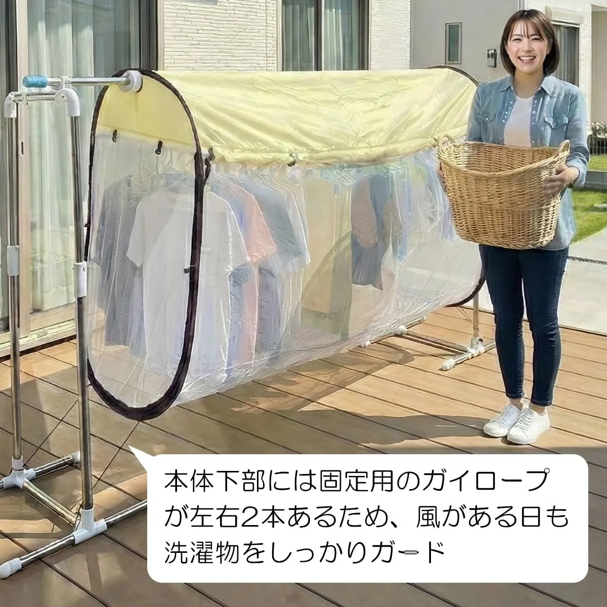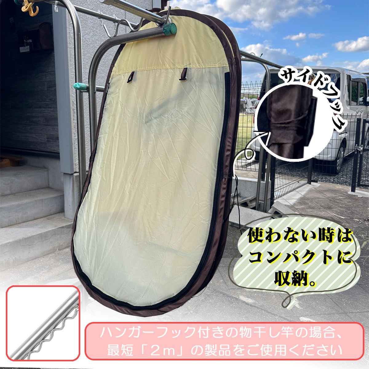 【使用中もしっかり固定】本体上部にスライド防止用のフックを取り付け、本体下部はガイロープで物干し竿台に固定するため、風によりカバーが動くということはありません。多少風のある日も安心して外干しできます。