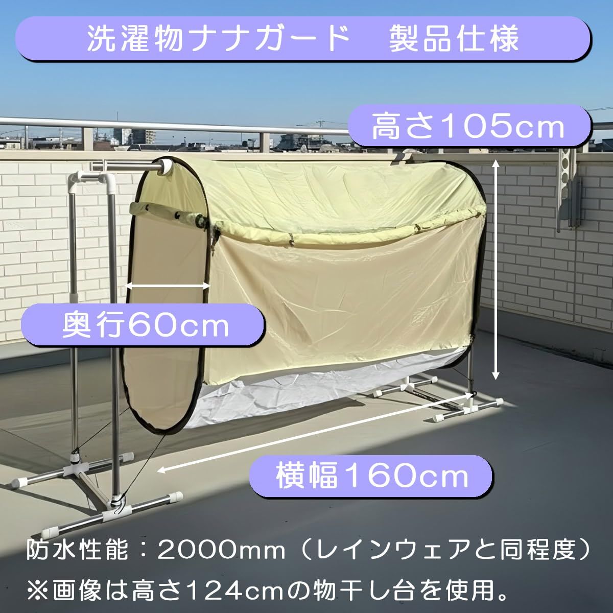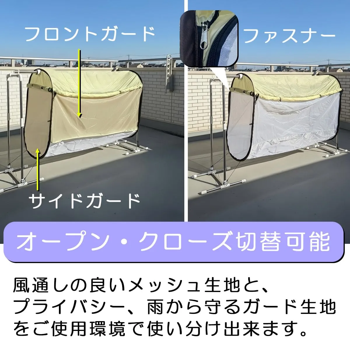 【プライバシーを守る】淡いベージュのカバーが前後左右にあり、それぞれファスナーで開閉可能。ご家庭の環境に合わせて洗濯物を外から見えなくするので防犯に役立ちます。 ※目隠しガードはファスナーで開閉し、ロールアップしてご使用いただけます。