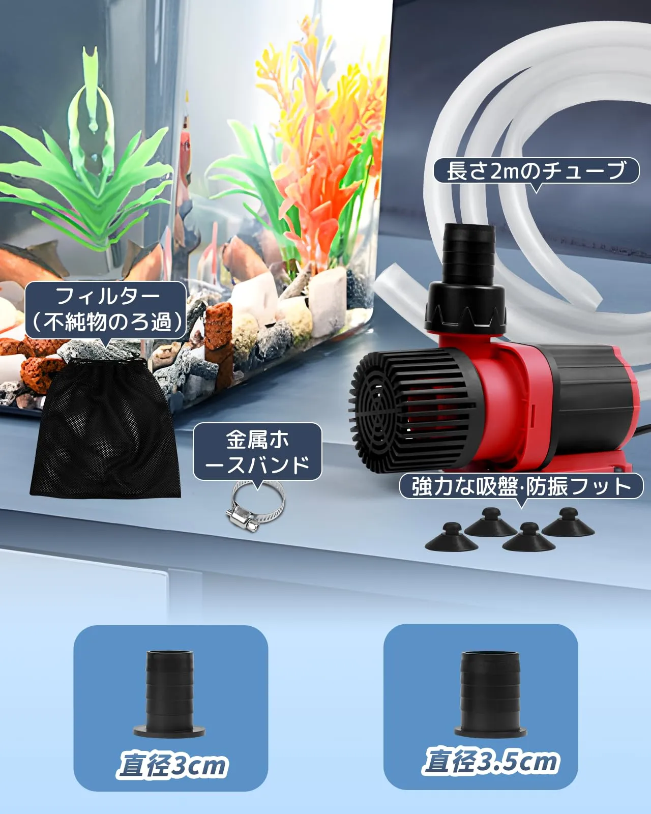 【付属品いっぱい】2mのチューブ、30/35mmの吐水口ノズル、フィルター、金属ホースバンド、強力な吸盤と防振フット、届いたらすぐに使えるのはOnlit水中ポンプだけです。