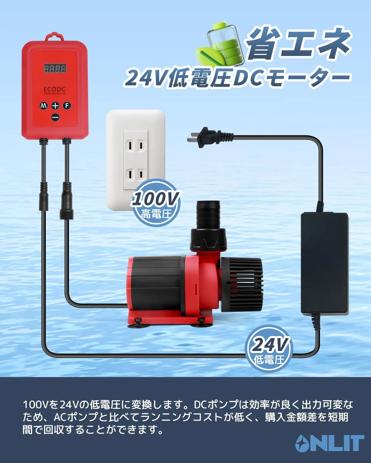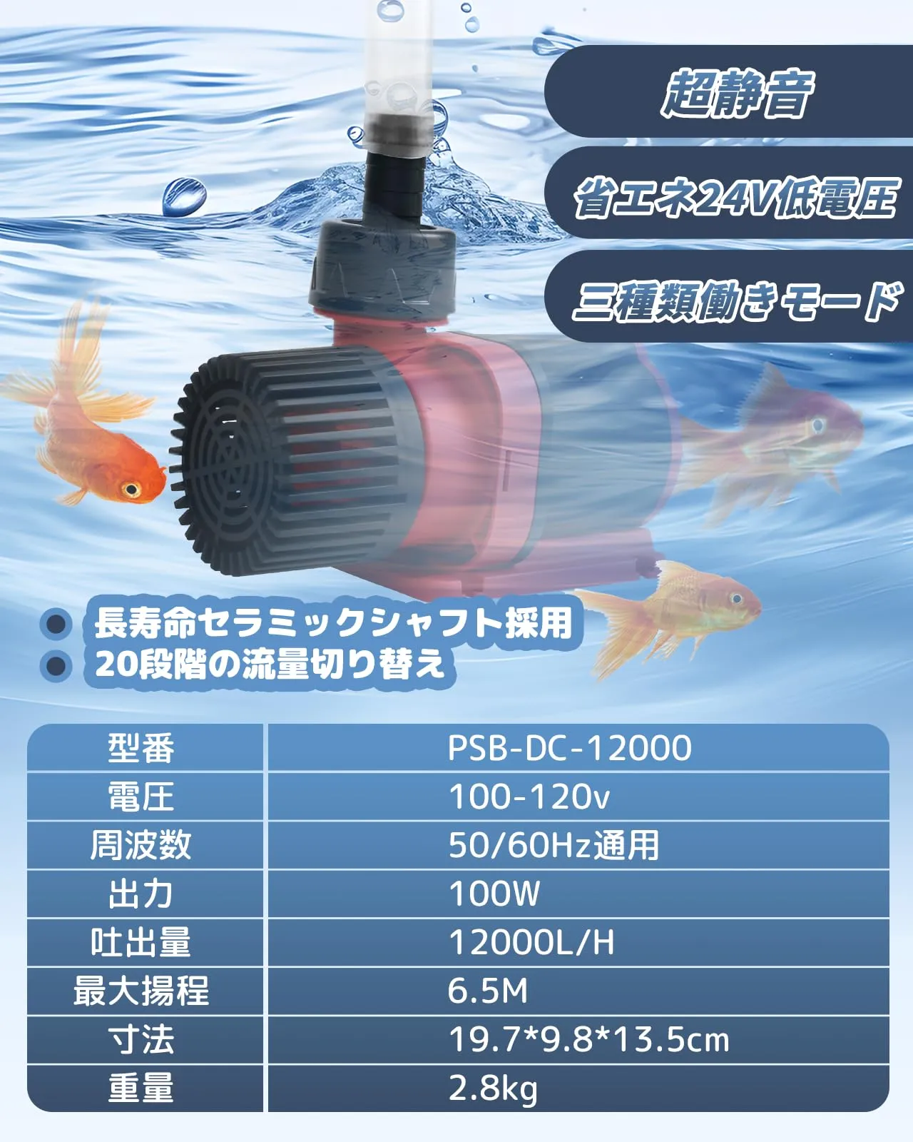 新品 Onlit 水中ポンプ 排水ポンプ 循環ポンプ 吐出量12000L/H 最大揚程6.5M 20段階流量調整 外部スイッチ 海水用 電動 清水用 家庭用 通常排水/ウェーブ/フィードモード 100W DC24V 50/60Hz通用 2mホース/フィルター付