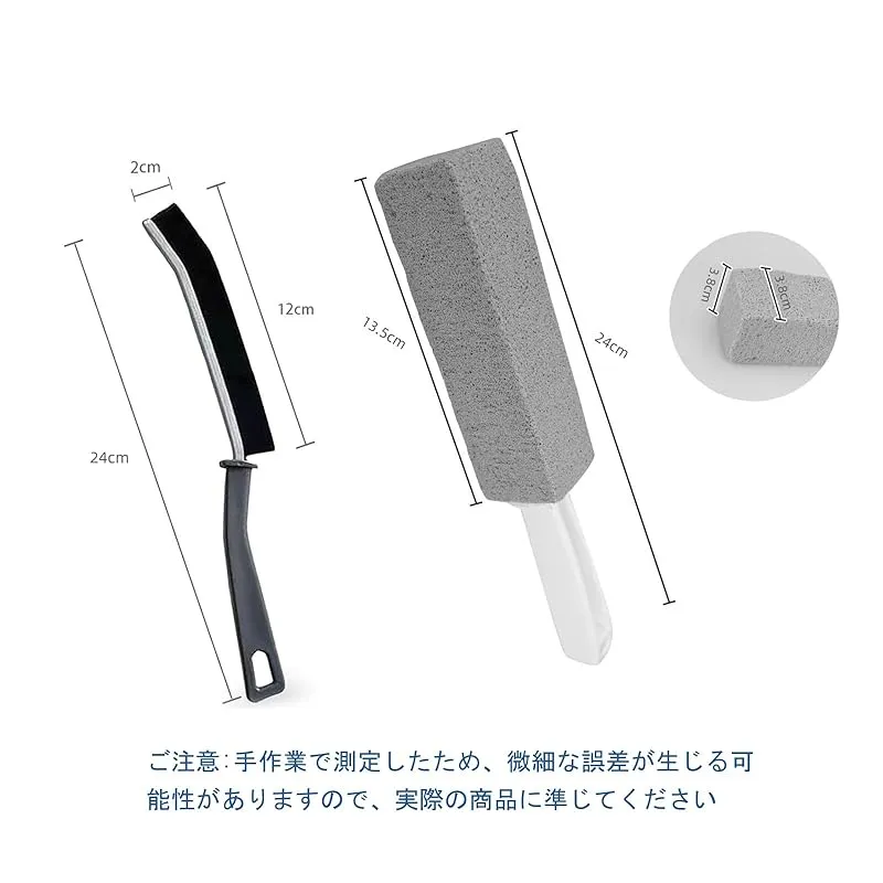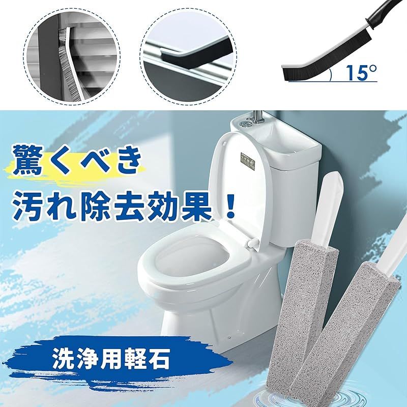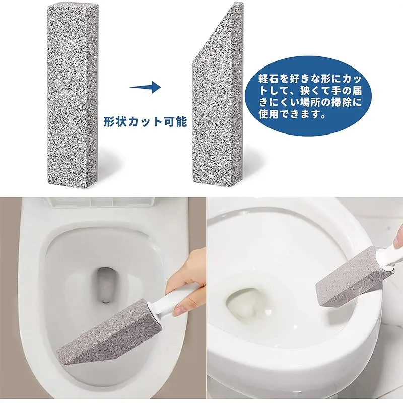 【商品概要】 製品仕様:トイレ掃除は100%天然の軽石なので、環境に優しく、人、動物、植物にとって無毒、無臭で安心安全に汚れを除去できるので、他社の水垢落とし尿石落としバブル商品よりも好ましい業務用ツールです。トイレブラシと隙間ブラシが2本ずつ付いているので、トイレの石灰汚れに簡単に対処できます。強力な薬剤でも、なかなか落ちないトイレ尿石を簡単に除去でき、安心してご使用ください。 効率アップ:タイプで手の届かない便器の裏側、洗面台の角等はカッター等でお好みの大きなに切って御使用ください。形状は御使用中に馴染むように変形していくので細かい所でも御使用頂けます。付属の溝ブラシも作業効率を向上させます。トイレ掃除だけではなく、 キッチンの排水口や水道蛇口などの水回り、コンロや電子レンジ、冷蔵庫の隙間のお掃除に大活躍します。 持ち手付き:トイレ掃除ブラシと隙間掃除ブラシも持ち手があることで、手が汚れにくいところも嬉しいポイントです。握りやすく力が入れやすいハンドル設計で、狭い場所や角部分にもしっかり届きます。また、持ち手部分に収納用の穴がついており、フックなどに引っ掛けることで省スペースの保管も可能です。頑固な汚れや水垢、サビ、黄ばみ、黒ずみなどもしっかり落とせるの軽石スティッククリーナーです。 使いやすい:トイレの尿石も水につけて擦るだけでカンタンにできます。使用後の削りカスは天然成分のため、そのまま洗えばきれいになります。優れた研磨力を持ちながら、表面を傷つけない柔らかな素材で、市販の洗剤でも落ちにくい汚れをスッキリ落とせる便利なお掃除アイテムです。ハンドルの上部に穴があり、使用後もそのままつるして簡単に収納できます。 幅広い用途:角型トイレ掃除棒と細い隙間ブラシも陶磁器製のトイレ、洗面台、浴槽、ショールーム、プールのタイル等、硬質表面の水垢やサビ跡などのしつこい汚れを軽くこするだけで簡単に落とせます。力を入れなくても簡単に汚れが落ちるので、お掃除が楽しくなり家中がピカピカになるので毎日快適に過ごせます。注記:使用前に灰色の擦りつける軽石を濡らしてください。より強力なクリーニング機能があります。