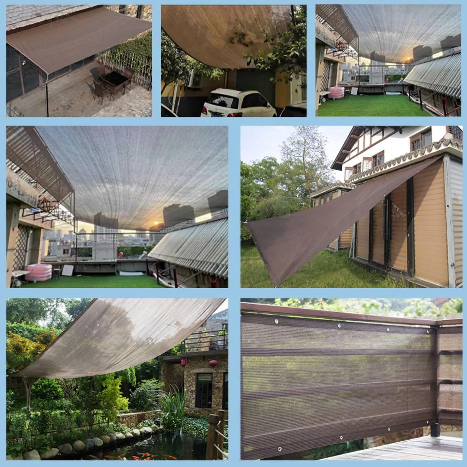 【適用場用】夏場が暑過ぎる東向き/南向きの窓やベランダ、車庫、カーポート、露天駐車で車の日除け、子供用プールの日よけ、庭先、玄関、天井等の日常生活のサンシェードです。それにアウトドア活動、キャンプ、登山、海辺など様々なところで利用できます。