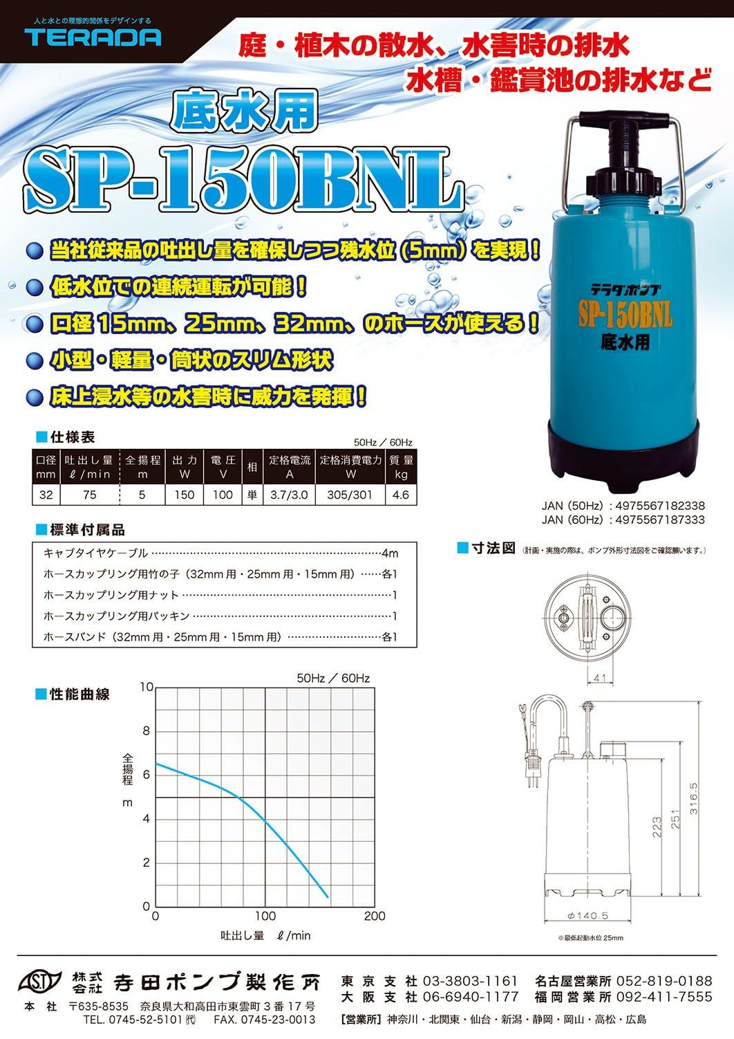 新品 寺田ポンプ製作所 底水用水中ポンプ SP-150BNL 60Hz